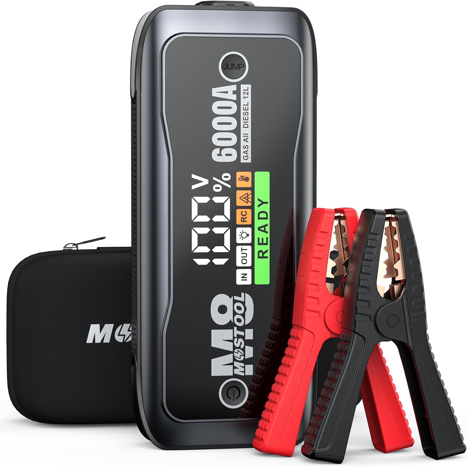 MOSTOOL M8 6000A Car Battery Jump Starter with Smart HD Display PD 60W Fast Charging, 12V Battery Jump Pack, Portable Jump Box with Jumper Clamps LED Light, Rugged Kit for All Gas & Up to 12.0L Diesel