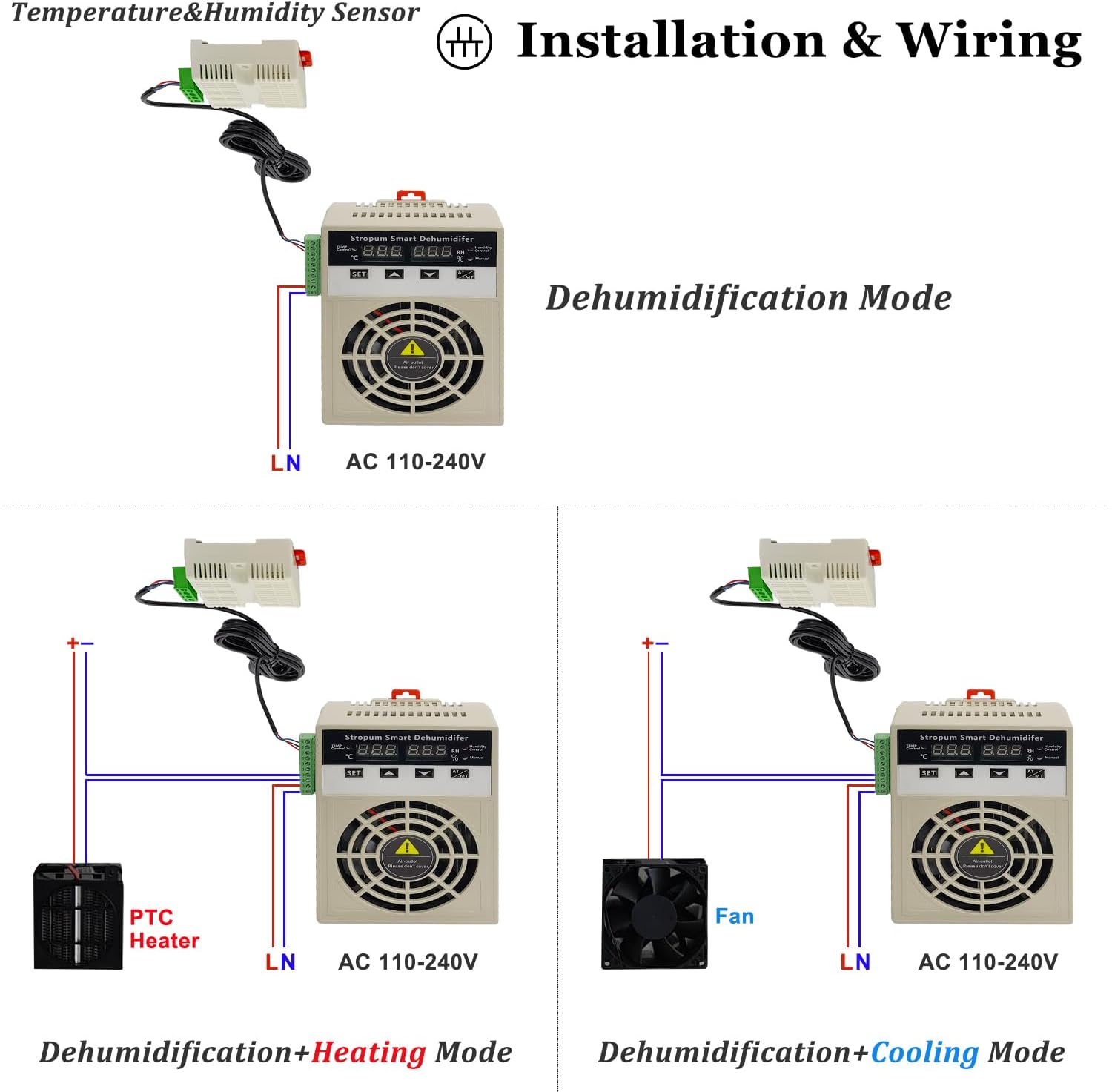 - Temperature Control Switch: The TEMP and humidity sensor could also detect the temperature of the space,and the temperature switch would follow the setting-value to open or close. Connecting the fan/heater,it colud achieve the temperature of the space up or down.