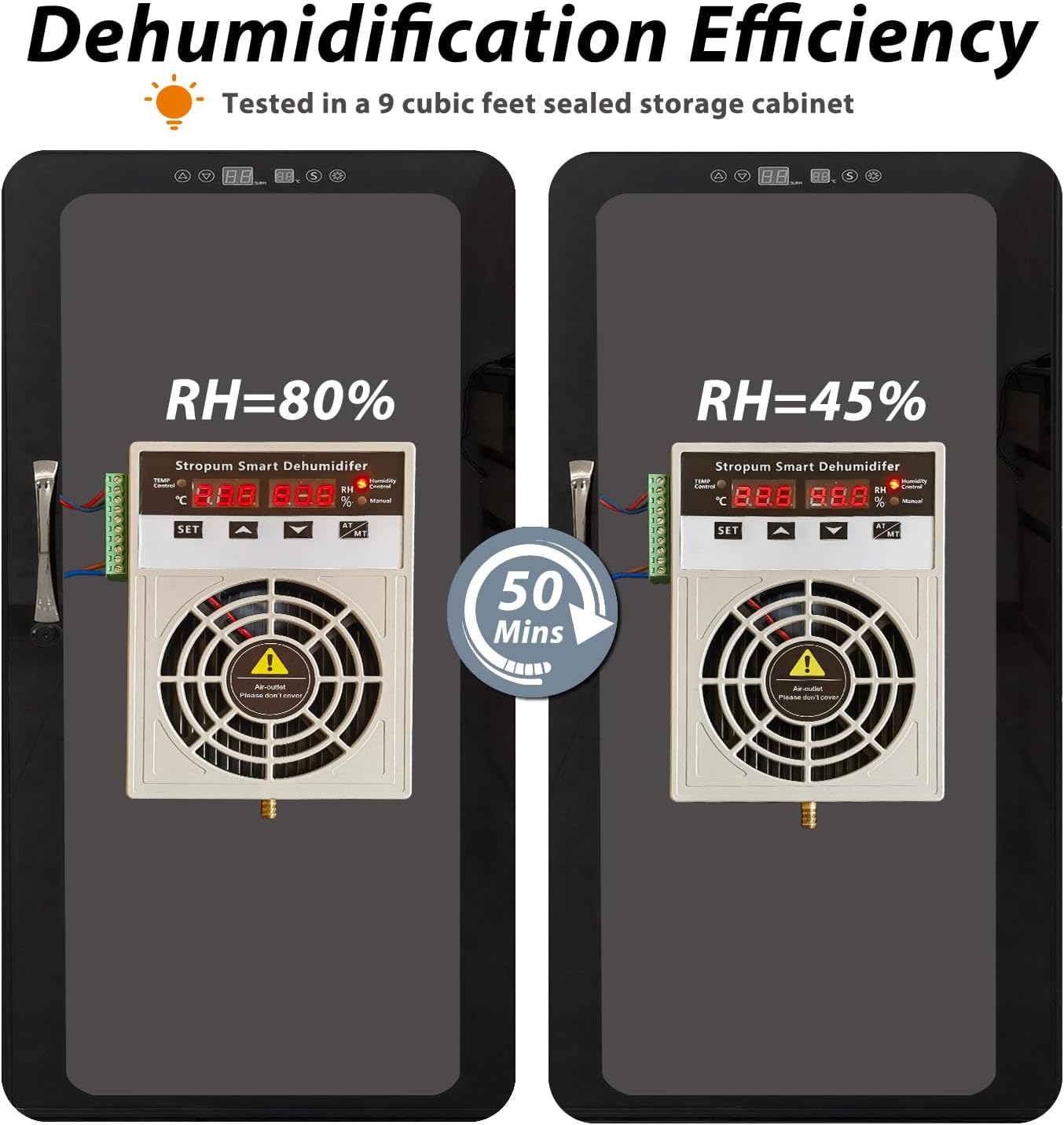 - AT/MT Mode Efficient Dehumidification:MT continue working mode and AT setting-value mode.We test the dehumidifier in a 9 cubic feet sealed storage cabinet,it took about 50 mins to reduce the humidity from 80% to 45%.
