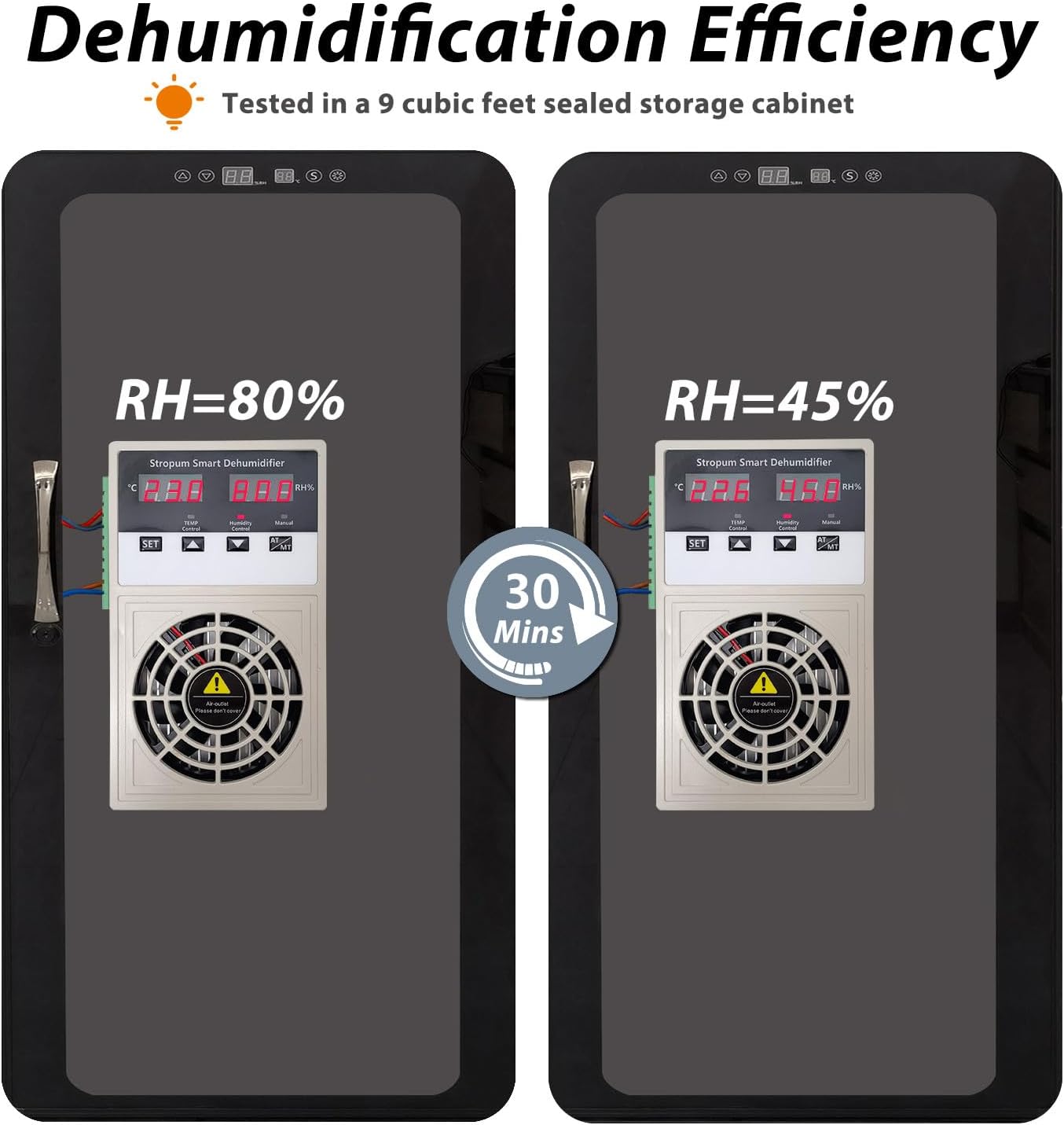 - AT/MT Mode Efficient Dehumidification:MT continue working mode and AT setting-value mode.We test the dehumidifier in a 9 cubic feet sealed storage cabinet,it took about 30 mins to reduce the humidity from 80% to 45%.