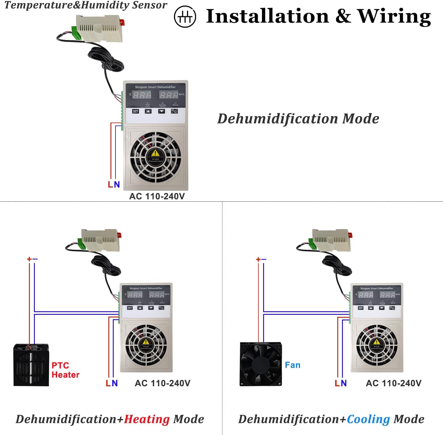 - Temperature Control Switch: The TEMP and humidity sensor could also detect the temperature of the space,and the temperature switch would follow the setting-value to open or close. Connecting the fan/heater,it colud achieve the temperature of the space up or down.