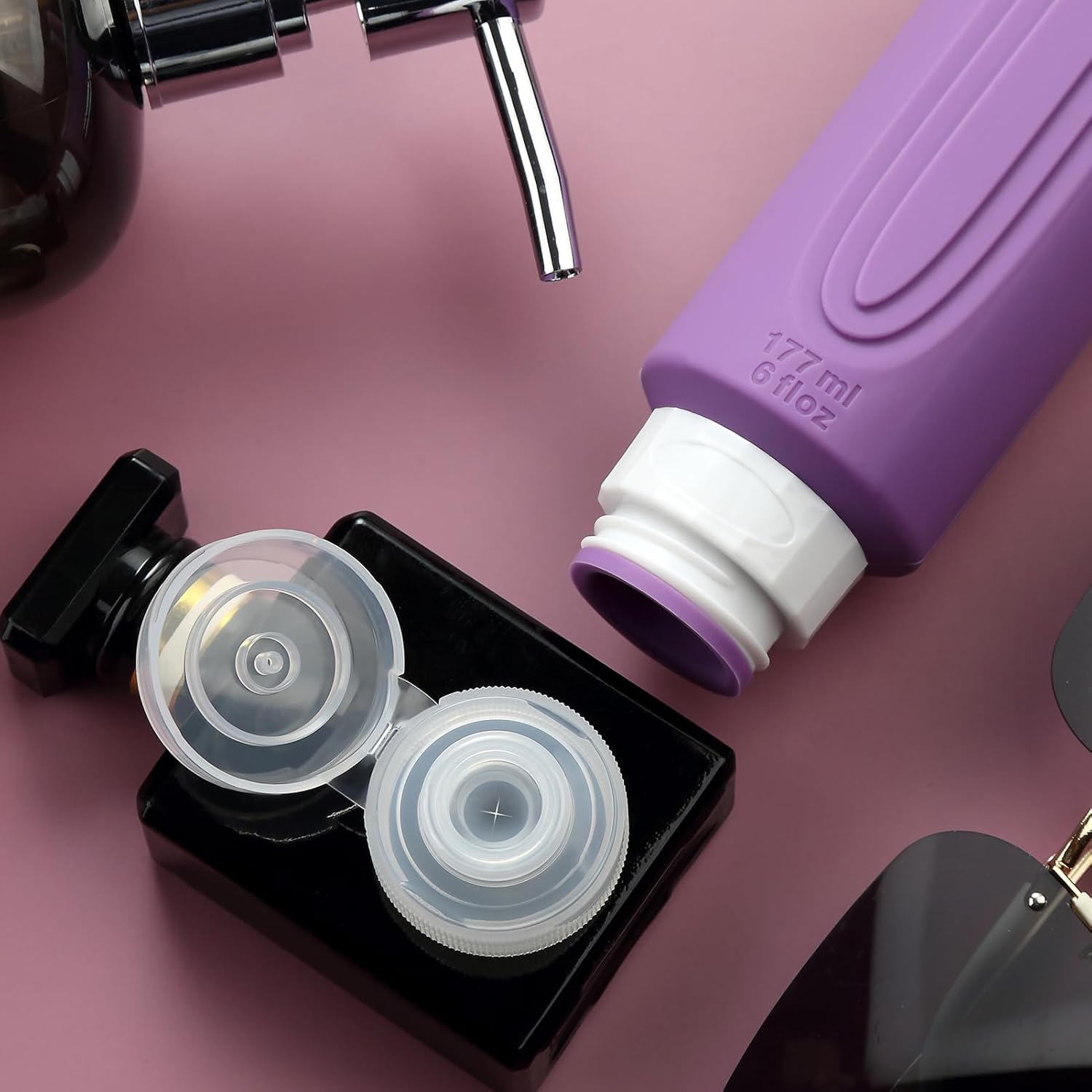 - Oversize 6oz travel bottle: Featuring a PVC toiletry bag, these travel-sized silicone bottles are perfect for storing and dispensing your favorite shampoos, lotions, and other liquids. Designed for convenience and durability, this travel set is a must-have for all your adventures.