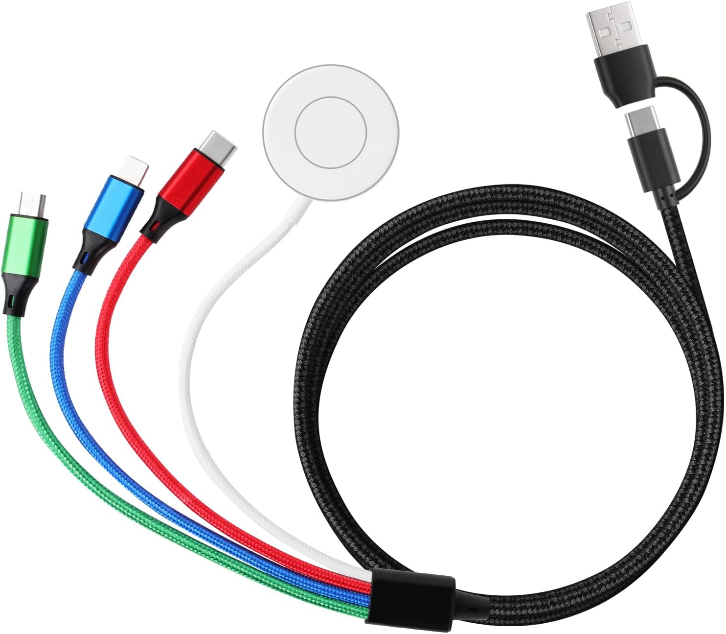 - 4 in 2 Multi Function: USB C multi charging cable with USB A or Type C to 4 different output ports including iOS Port/Type C/Micro USB and iWatch charger. Support to charge four devices at the same time