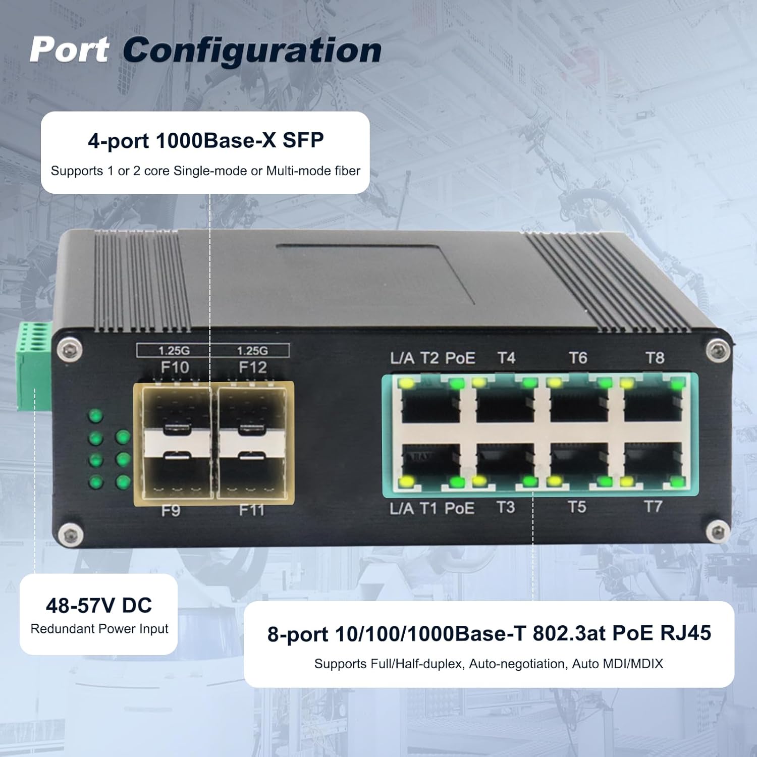 - 【12-port Gigabit transmission】The network switch equipped with 8 10/100/1000M RJ45 ports and 4 1000Base-X SFP Ports, providing higher-speed connectivity for your devices.
