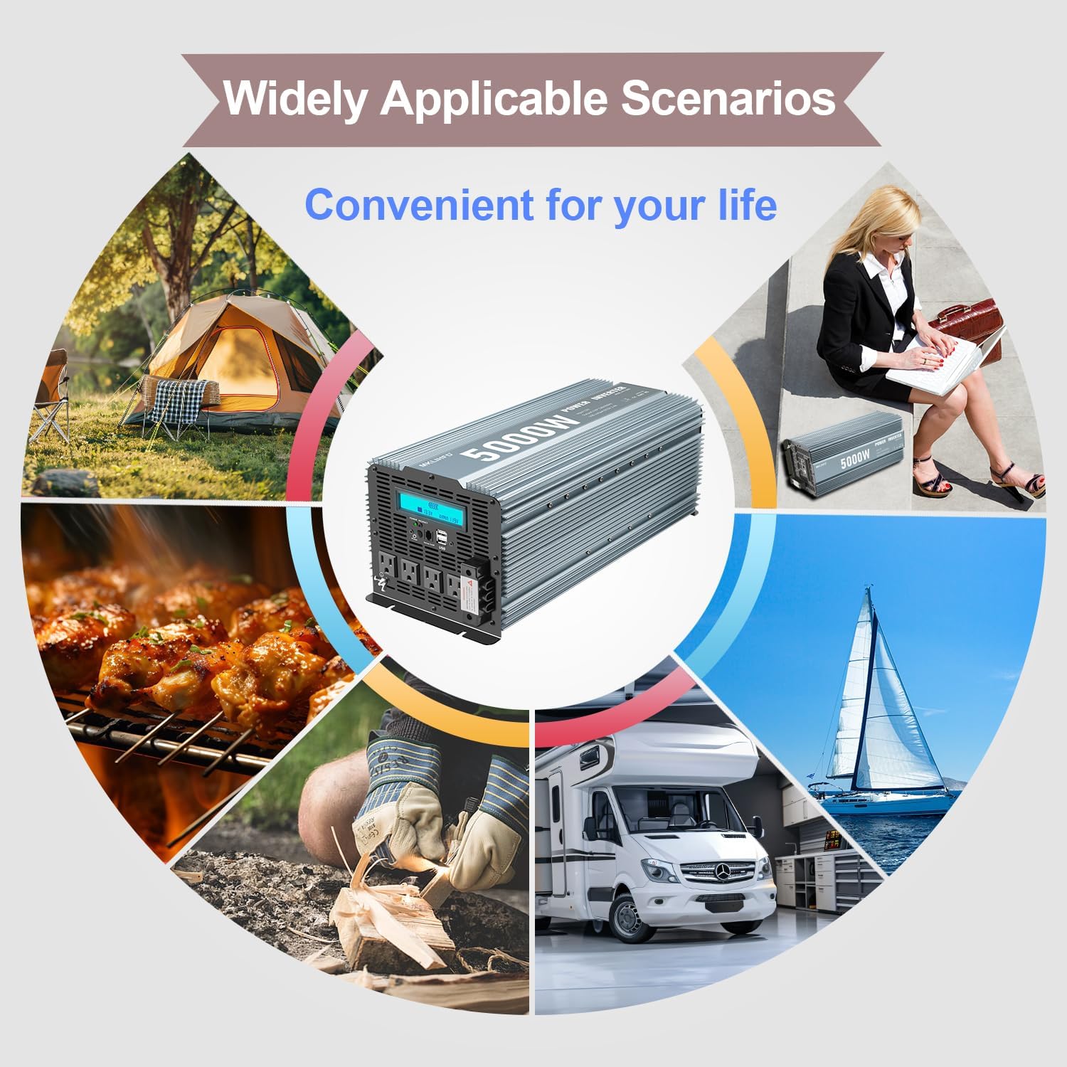 - {Multiple usage scenarios} You just need to connect the 5000 watt inverter to the 12V battery through a cable, and you can use 110V AC power anytime and anywhere. Ac appliances or devices for power outages, emergencies, hurricanes, holidays, cars, RVS, trucks, solar power, remote workplaces, or any place that requires AC power, such as TVS, ovens, floodlights, laptops, DVDS, players, cell phones, ipads, PSPS, cameras, etc.