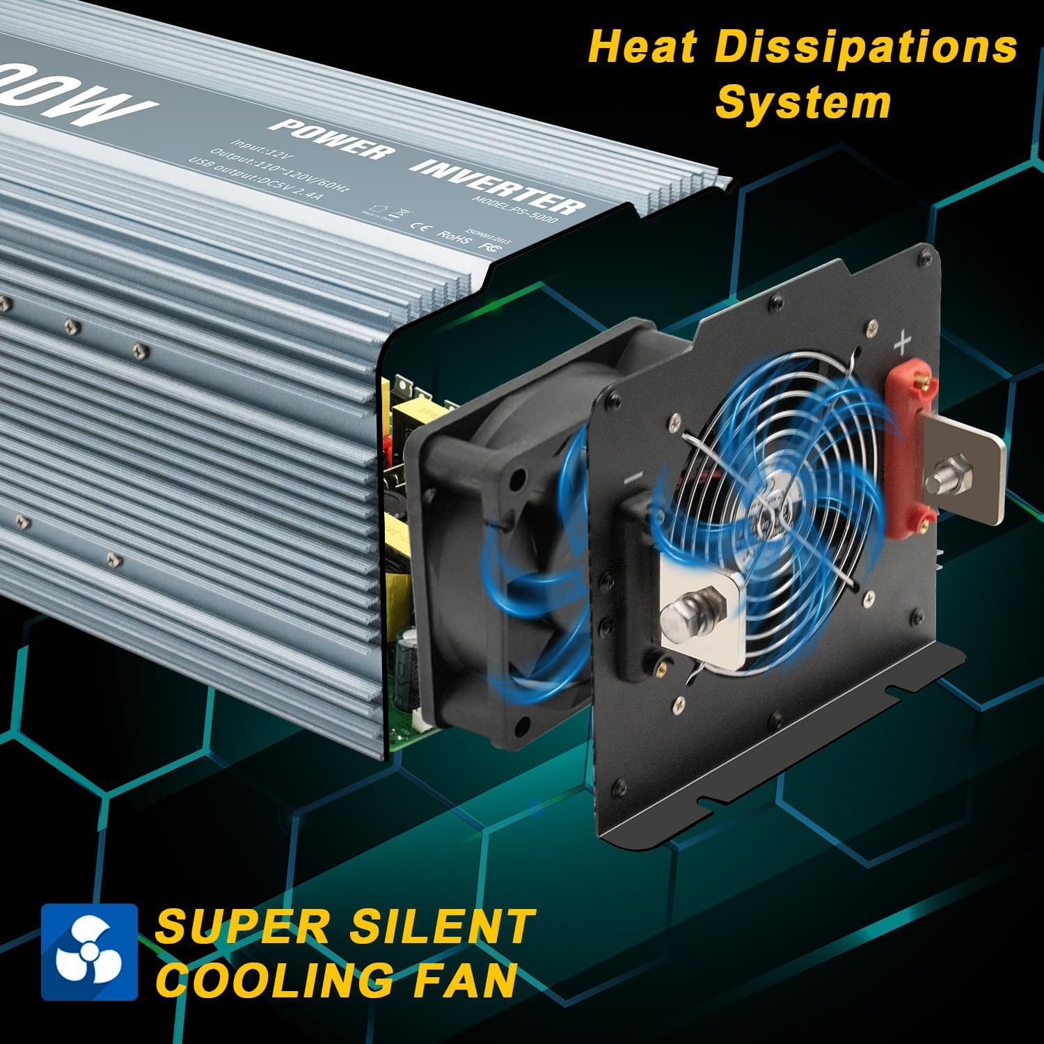 - {Intelligent fan cooling} This 12v inverter uses an intelligent fan system to dissipate heat during the entire operation. When the internal temperature of the machine reaches a certain level, the fan rotates to effectively reduce the temperature.