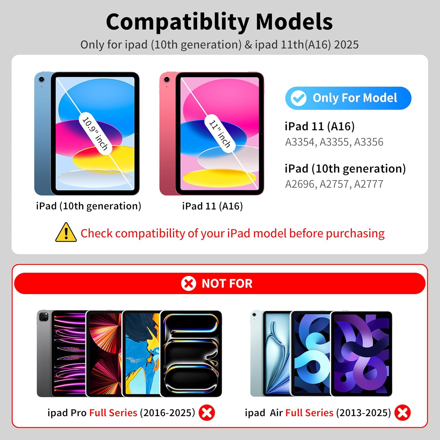 - Compatible Devices : iPad (10th generation) Model: A2696, A2757, A2777 and iPad 11 (A16) Model: A3354, A3355, A3356