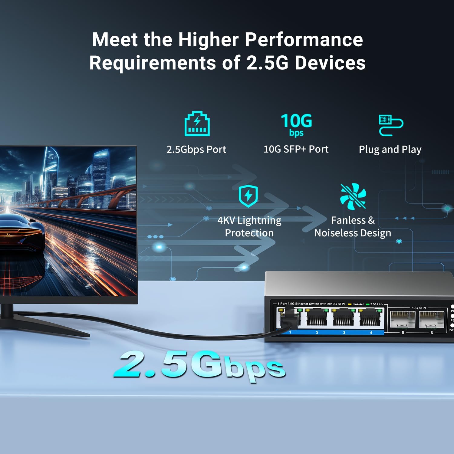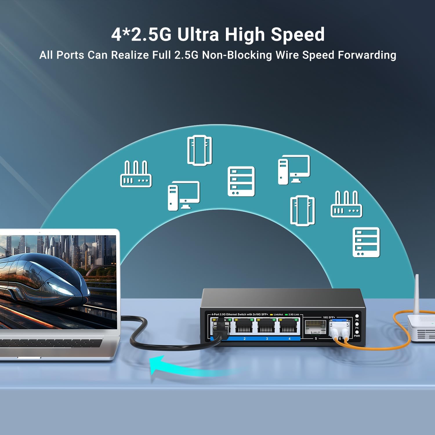 6 Ports 2.5Gb Unmanaged Ethernet Switch with 4* 2.5G Base-T Ports, 2* 10G SFP+ Ports. 2.5Gbps Network Switch for 2.5Gbps NAS/PC, WiFi6 Router, Wireless AP. Fanless Design, Plug and Play