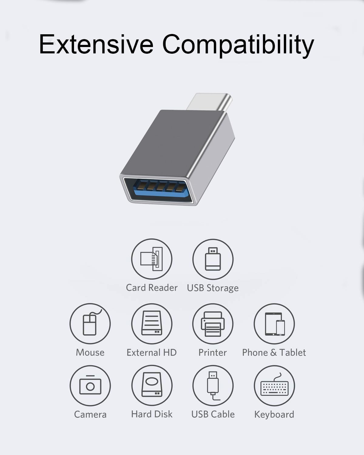 - Widely Compatible: Transform any USB-C port into a USB-A port and connect up a wide range of USB-A devices including external hard drives, phones, mice, printers, Type C laptops, tablets, OTG phones including Samsung Galaxy S24,S23,S22,S21,S20, MacBook Pro after 2016, MacBook Air after 2018, iPad Pro and can be used with 2 mm thick phone cases and more.