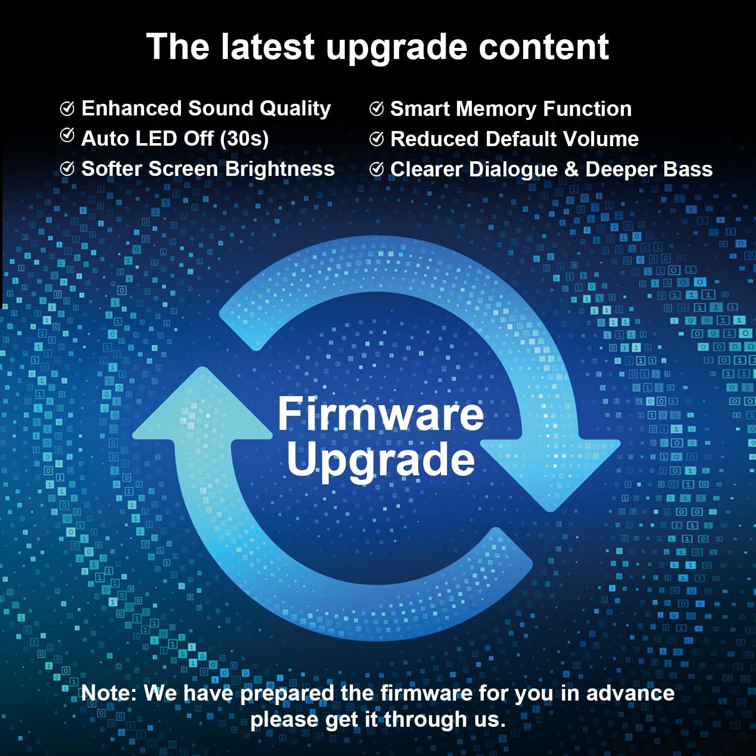 - The latest update content - Memory function: The soundbar will remember your current settings after shutting down, so you don't need to reset them when you restart it. Enhanced Sound Quality & Deeper Bass: The sound quality is clearer, eliminating the noise, and the bass is increased, especially at low volumes. The remote control bass can be adjusted in a wider range. Reduce display brightness: The display brightness is no longer glaring and automatically turns off after 30 seconds. Reduce default initial volume: When restoring the default state, the volume is 5 levels lower than the previous firmware.