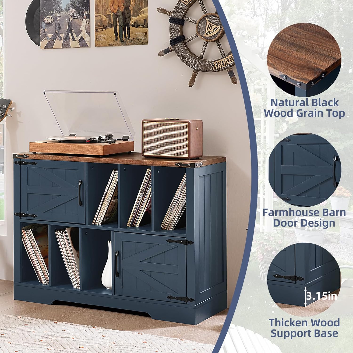 Large Record Player Stand with Vinyl Storage Up to 450 Albums, 39 Inch Farmhouse Wood Navy Blue Vinyl Records Storage Cabinet with Barn Doors, Mid-Century Turntable Stand for Living Room