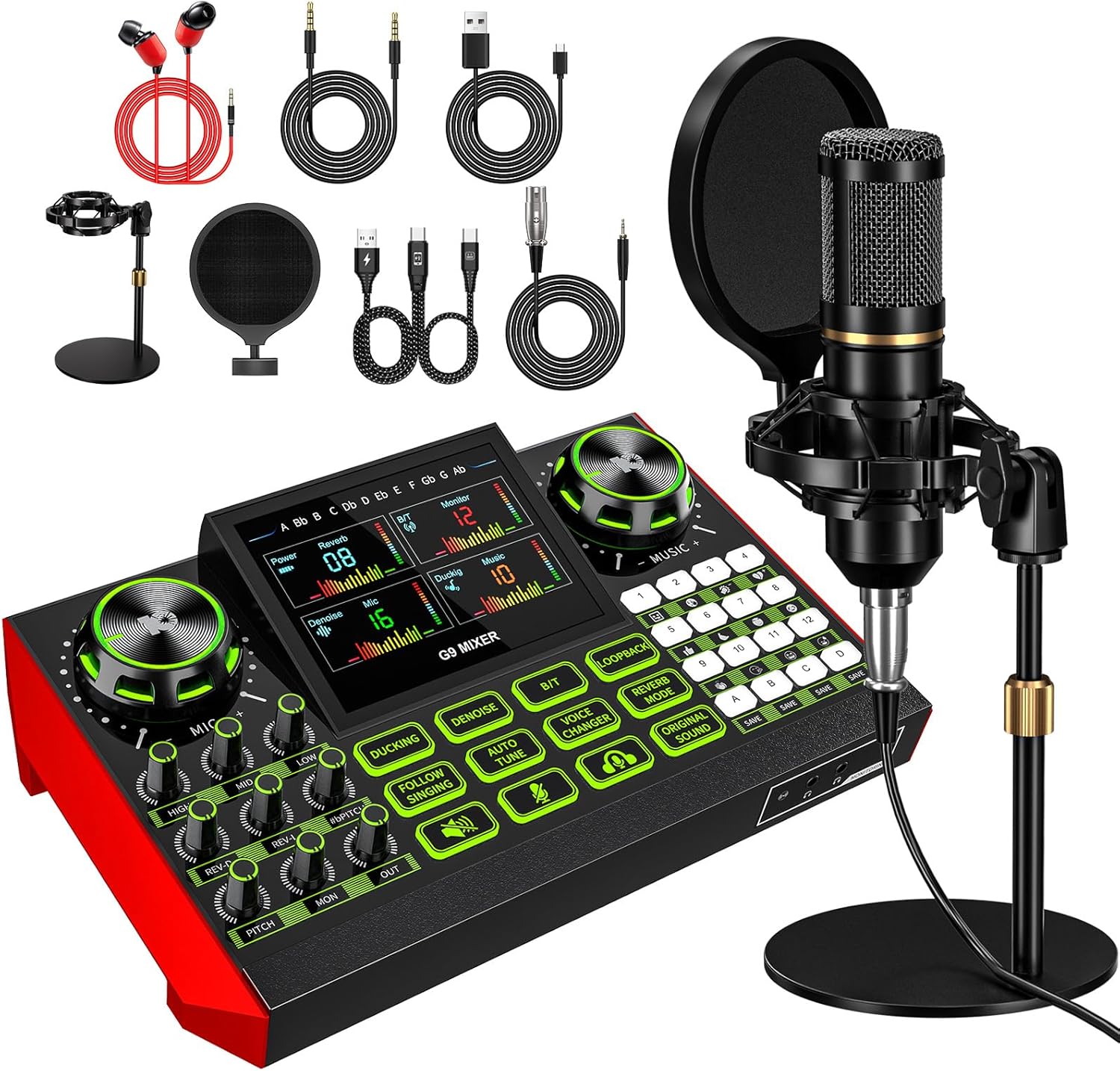 - podcast equipment bundle:The podcast microphone bundle includes everything you need for professional-quality audio creation: a 3.5mm condenser microphone with a boom arm and the Sound Board. Perfect for podcasters, gamers, streamers, and content creators who want an all-in-one solution for mixing, recording, and streaming.
