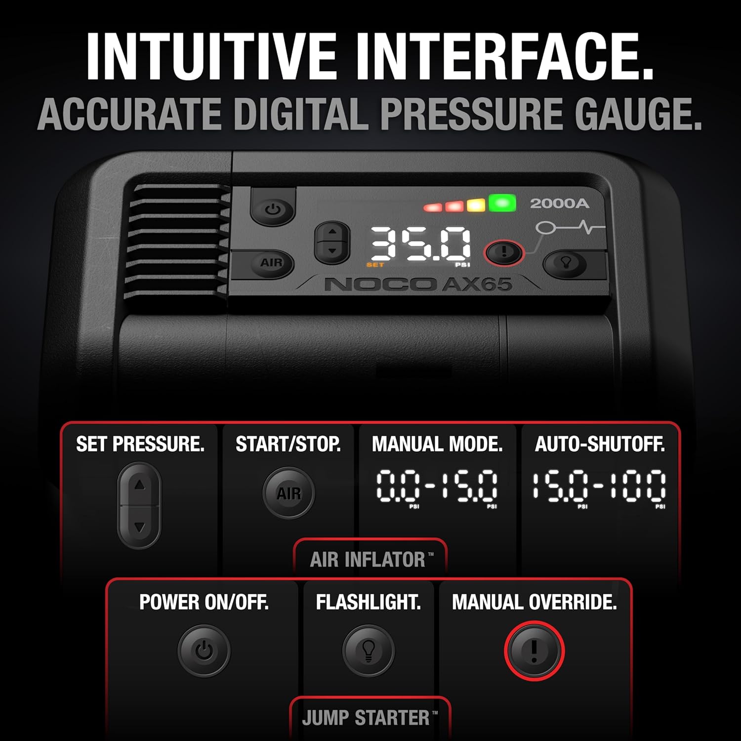 - ALL-NEW AX65 — A powerful all-in-one jump starter, ultra-fast tire inflator, power bank, and LED flashlight - built for total roadside independence. Delivers 2000 amps, rapid inflation, USB-C charging, and lighting when you need it most.