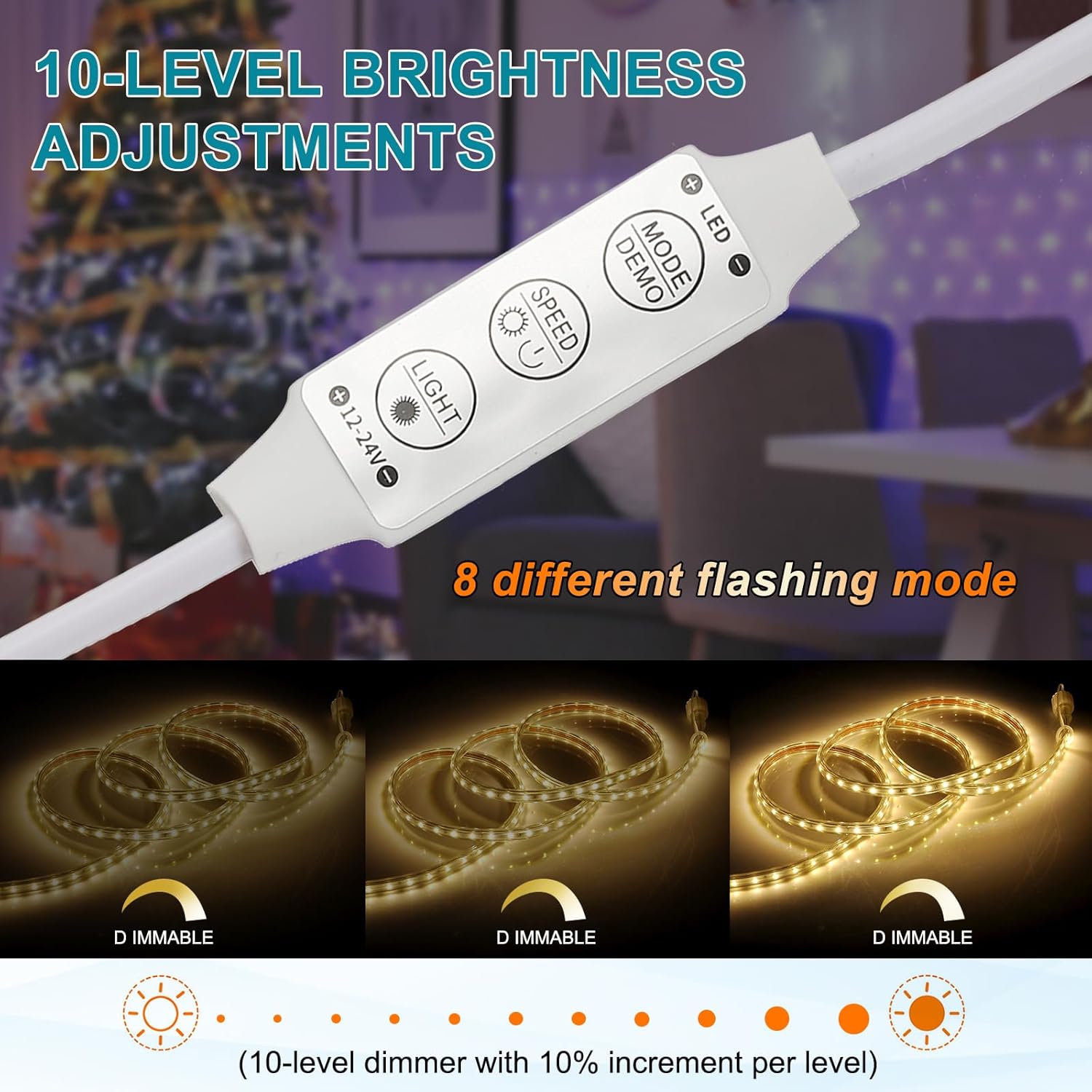 - 1. With different dynamic modes and 10-level brightness adjustments, you can easily create the perfect ambiance for any setting. 2. The LED strip dimmer also has a memory function. When it powers off, you don't need to select the mode and brightness level again.