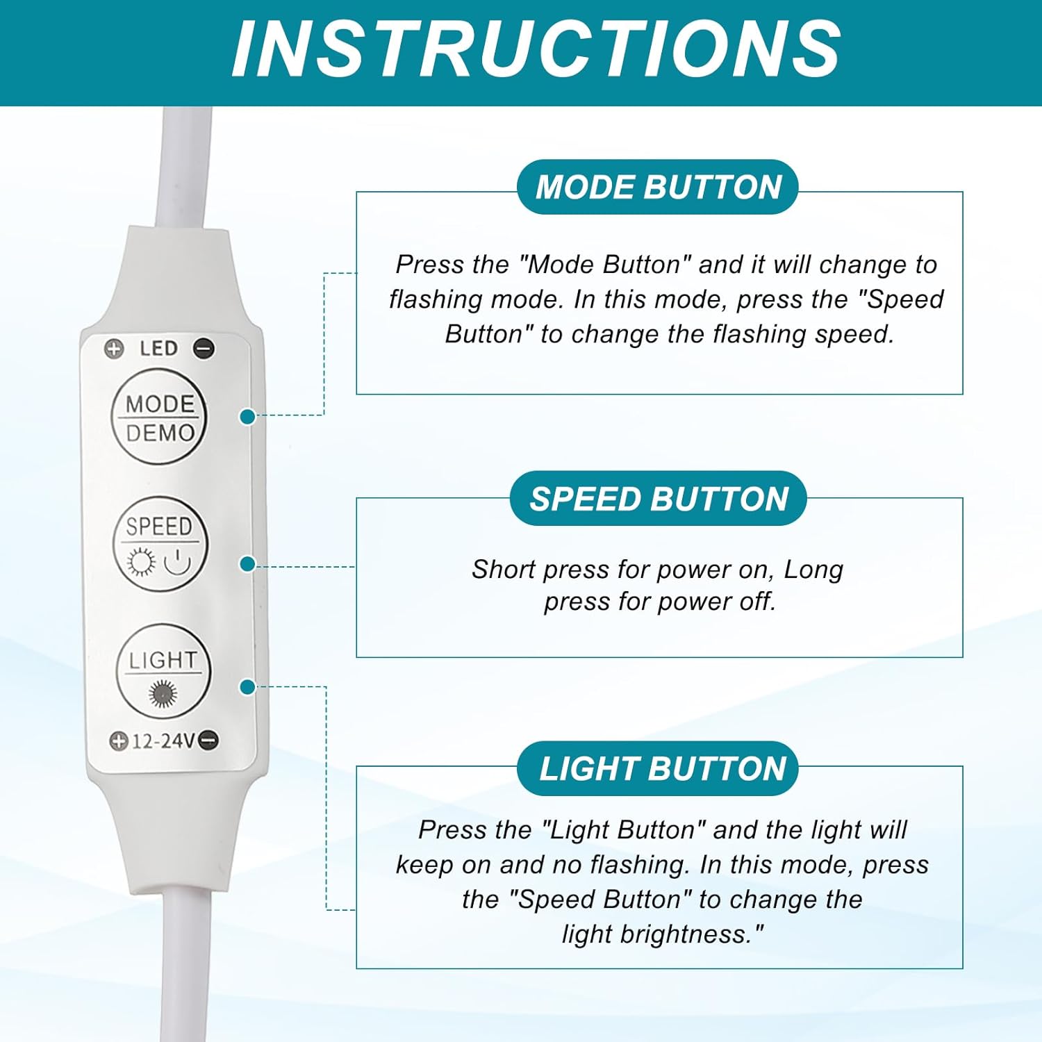 - 1."Speed Button": Short press for power on, Long press for power off. 2."Mode Button": Press the "Mode Button" and it will change to flashing mode, there is 8 different flashing mode and you can change the flashing mode by pressing the "Mode Button". In this mode, the "Speed Button" can change the flashing speed. 3."Light Button": Press the "Light Button" and the light will keep on and no flashing. In this mode, the "Speed Button" can change the light brightness.
