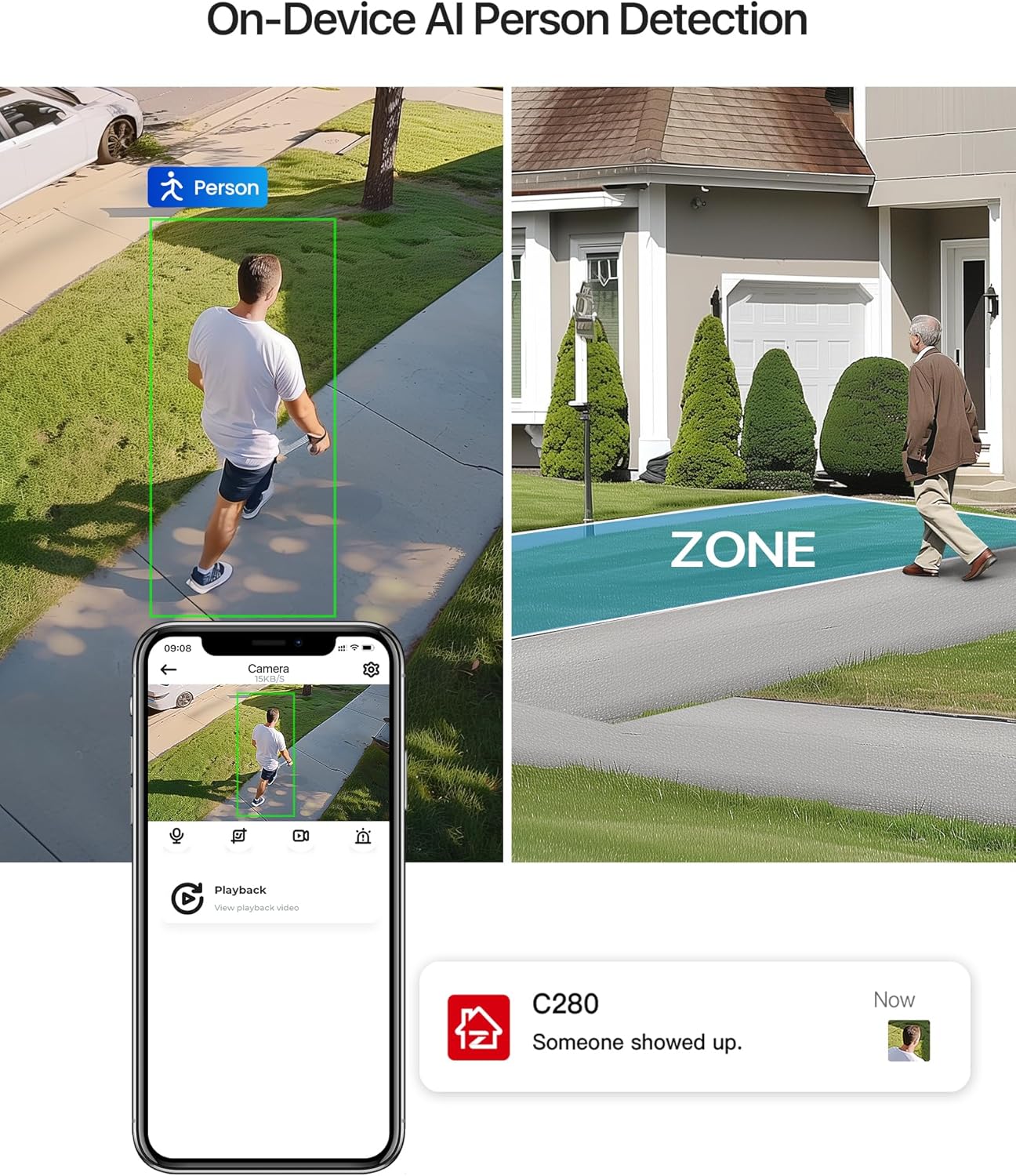 - (4). [ Smart AI Detection & Real-Time Alerts ]__ Utilizing cutting-edge AI technology, the ZOSI smart WiFi camera offers accurate human detection, significantly minimizing false alarms. You can customize detection zones to prioritize key areas of interest. When motion is detected, the camera triggers sound and spotlight alarms, sending real-time push notifications and email alerts to keep you promptly informed of any potential threats.