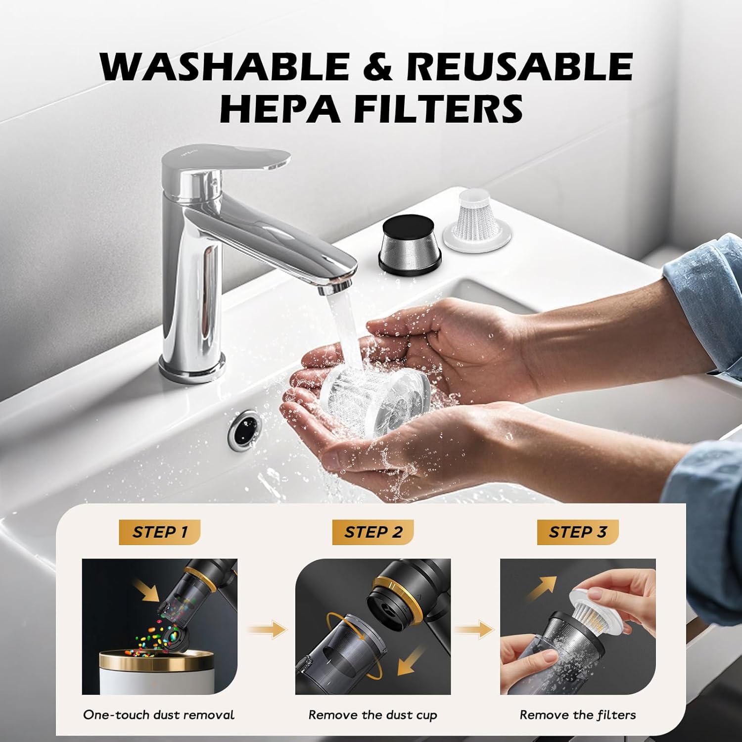- Eco-Friendly Cleaning: Featuring washable & reusable HEPA and metal filters, this car vacuum reduces waste and saves you money on replacements.The durable metal filter captures large debris, while the HEPA filter traps fine particles like dust and allergens. And the one-click dust emptying design allows for simple and hygienic disposal of debris, keeping your hands clean