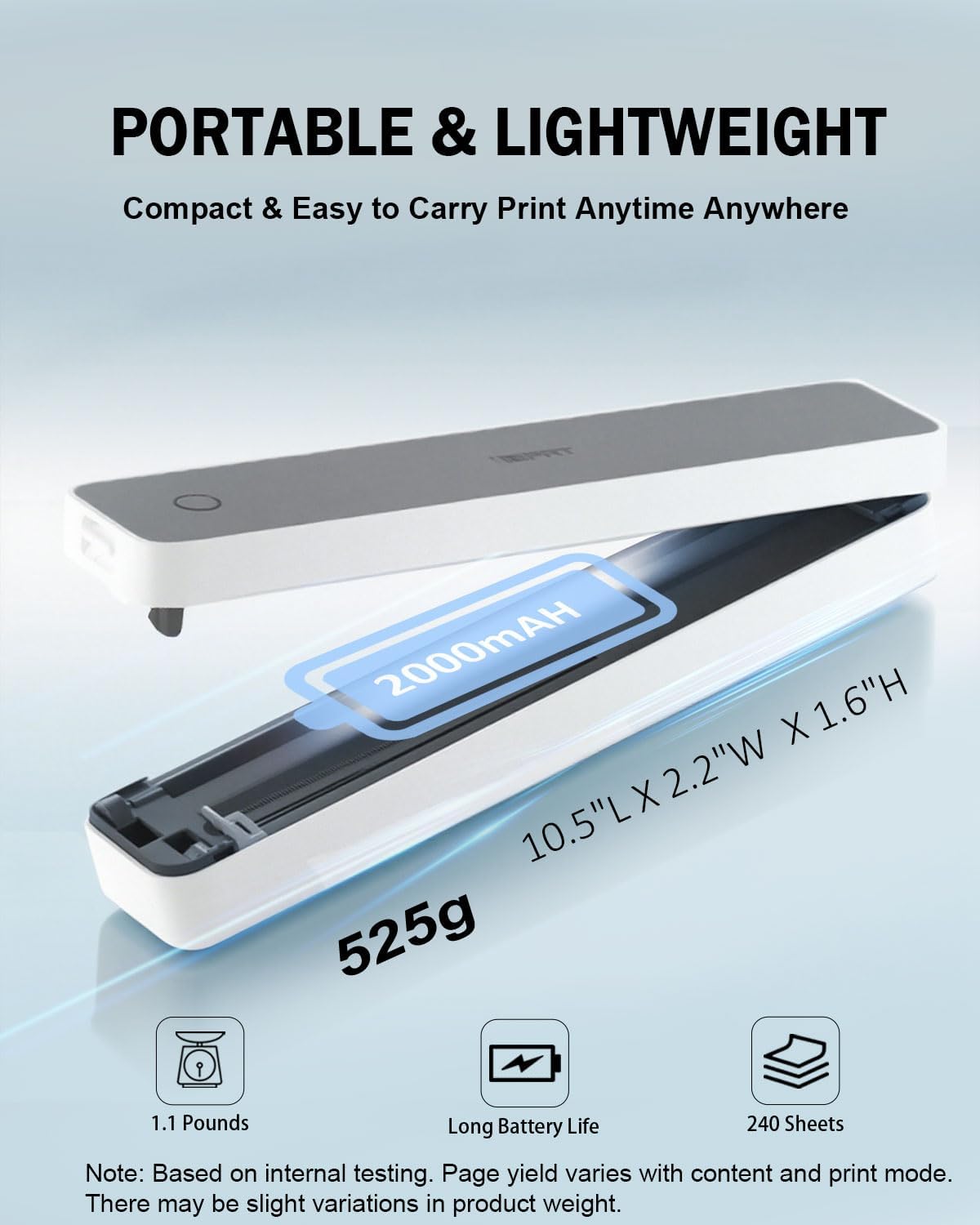 - ✅ Ultra Light Travel Printer– At just 1.1lb (526g) and 1.6 inches thick, this portable thermal printer fits easily into your backpack or work bag. Whether you're on a business trip, campus, café, or coworking space, print contracts, lecture notes, or documents on the go—no desk needed!