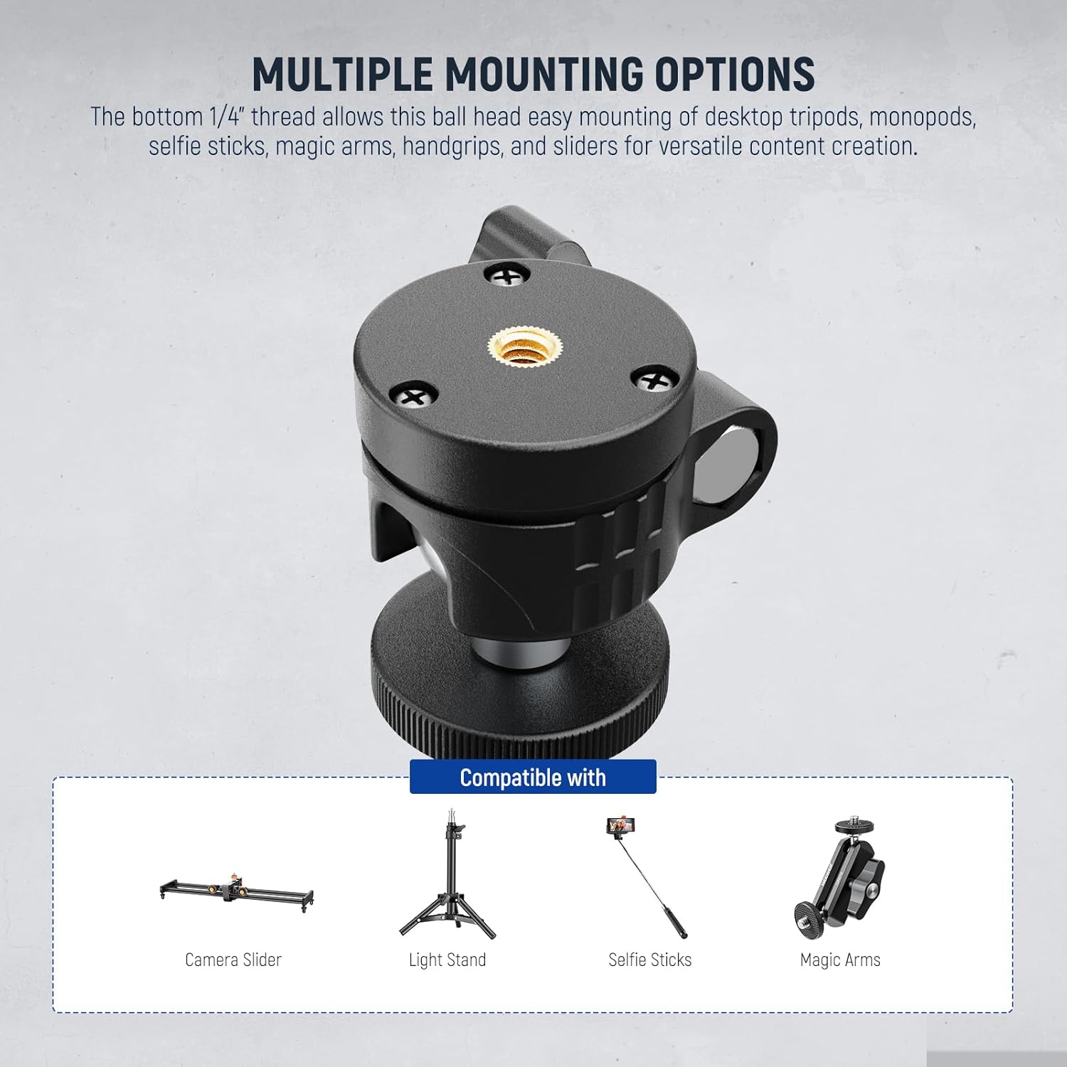 - 【Multiple Mounting Options】 The bottom 1/4" thread allows this ball head easy mounting of desktop tripods, monopods, selfie sticks, magic arms, handgrips, and sliders for versatile content creation