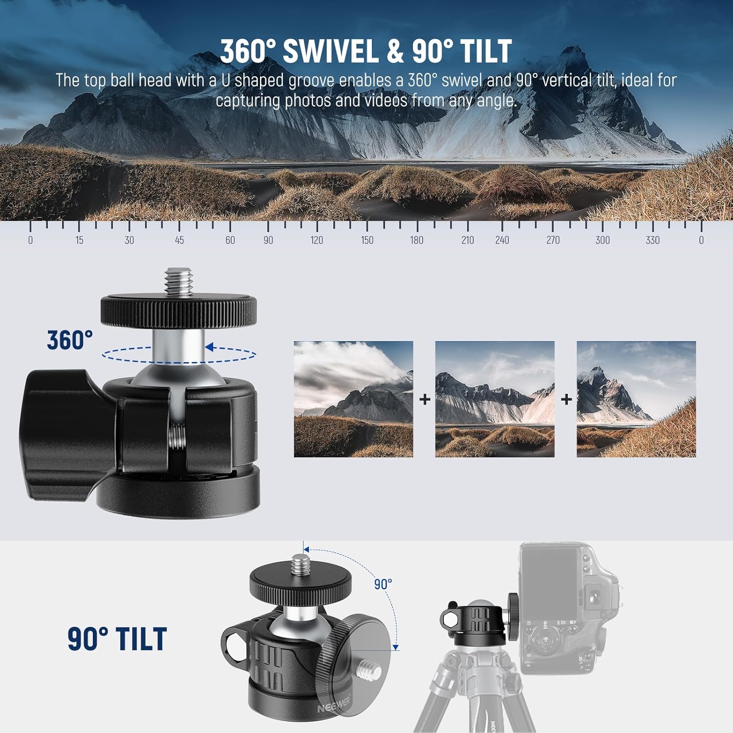 - 【360° Swivel & 90° Tilt】 The top ball head with a U shaped groove enables a 360° swivel and 90° vertical tilt, ideal for capturing photos and videos from any angle and making it essential for content creators and must have for influencer