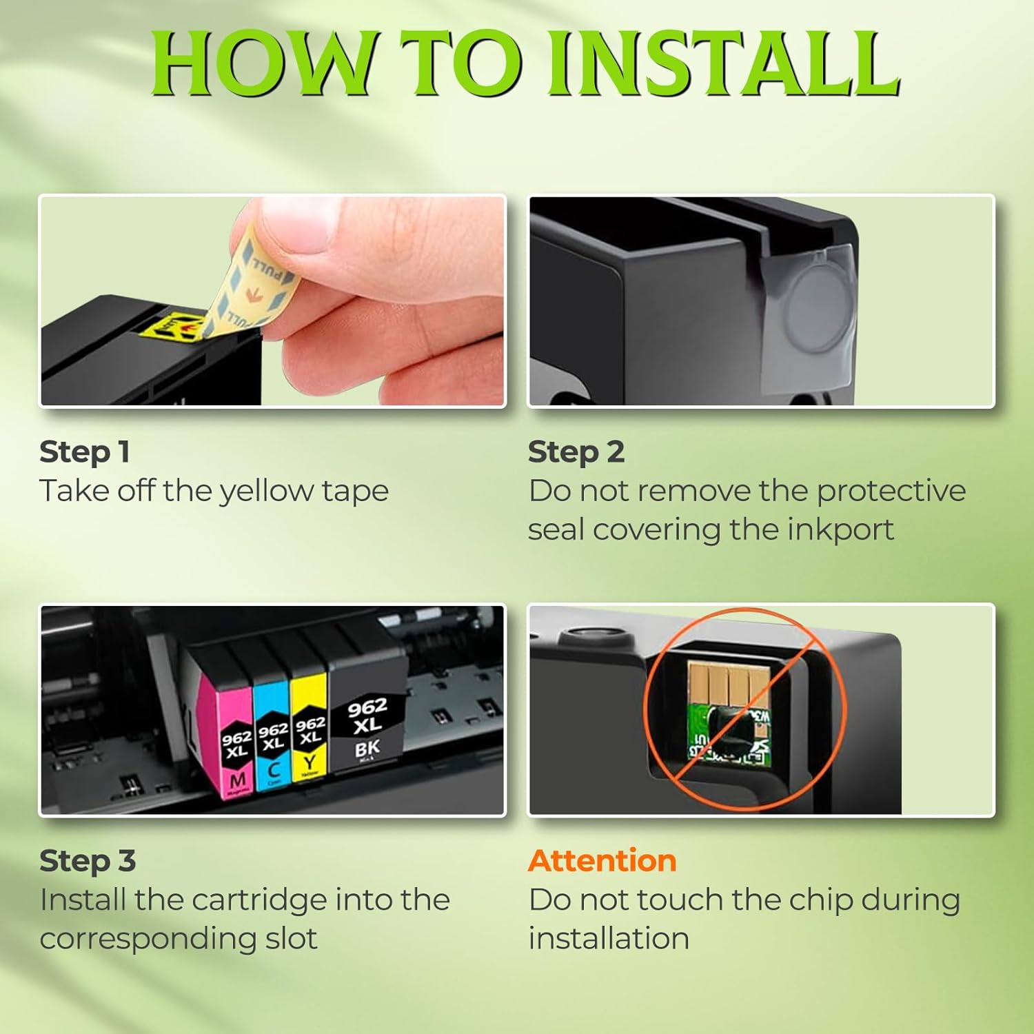 - Package Includes: 962 xl printer ink cartridges combo pack 962 962XL 962 XL (1 Black 1 Cyan 1 Magenta 1 Yellow) 4 Packs.