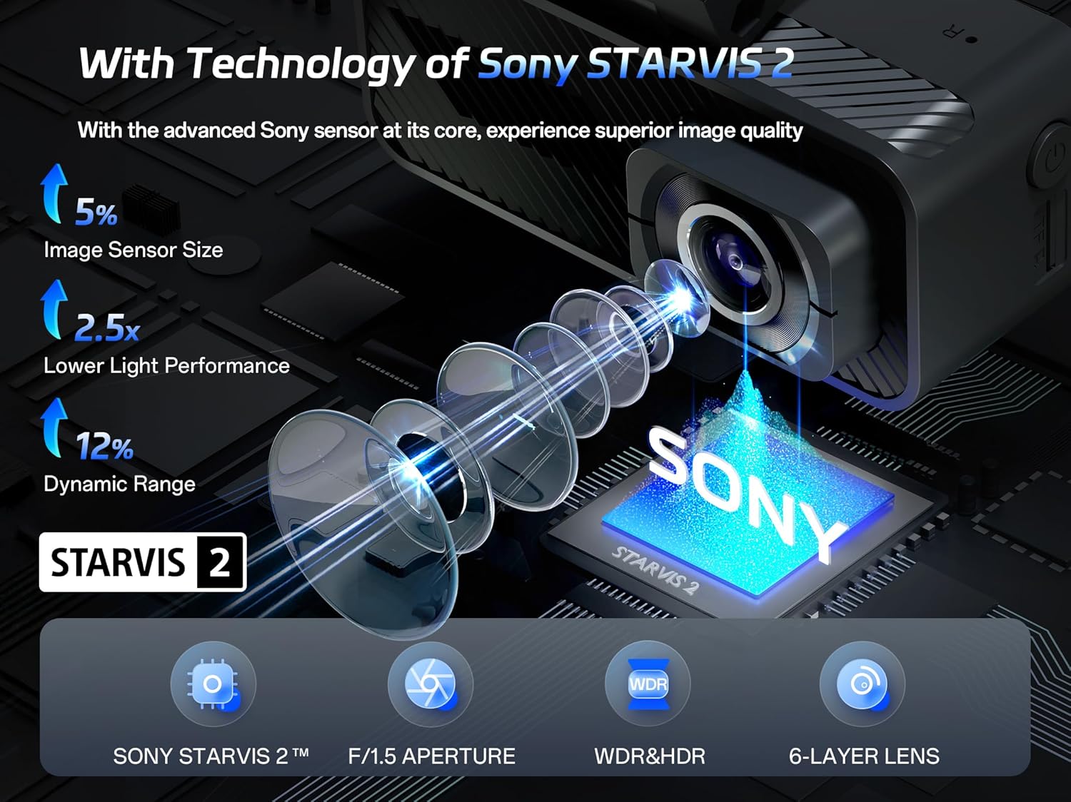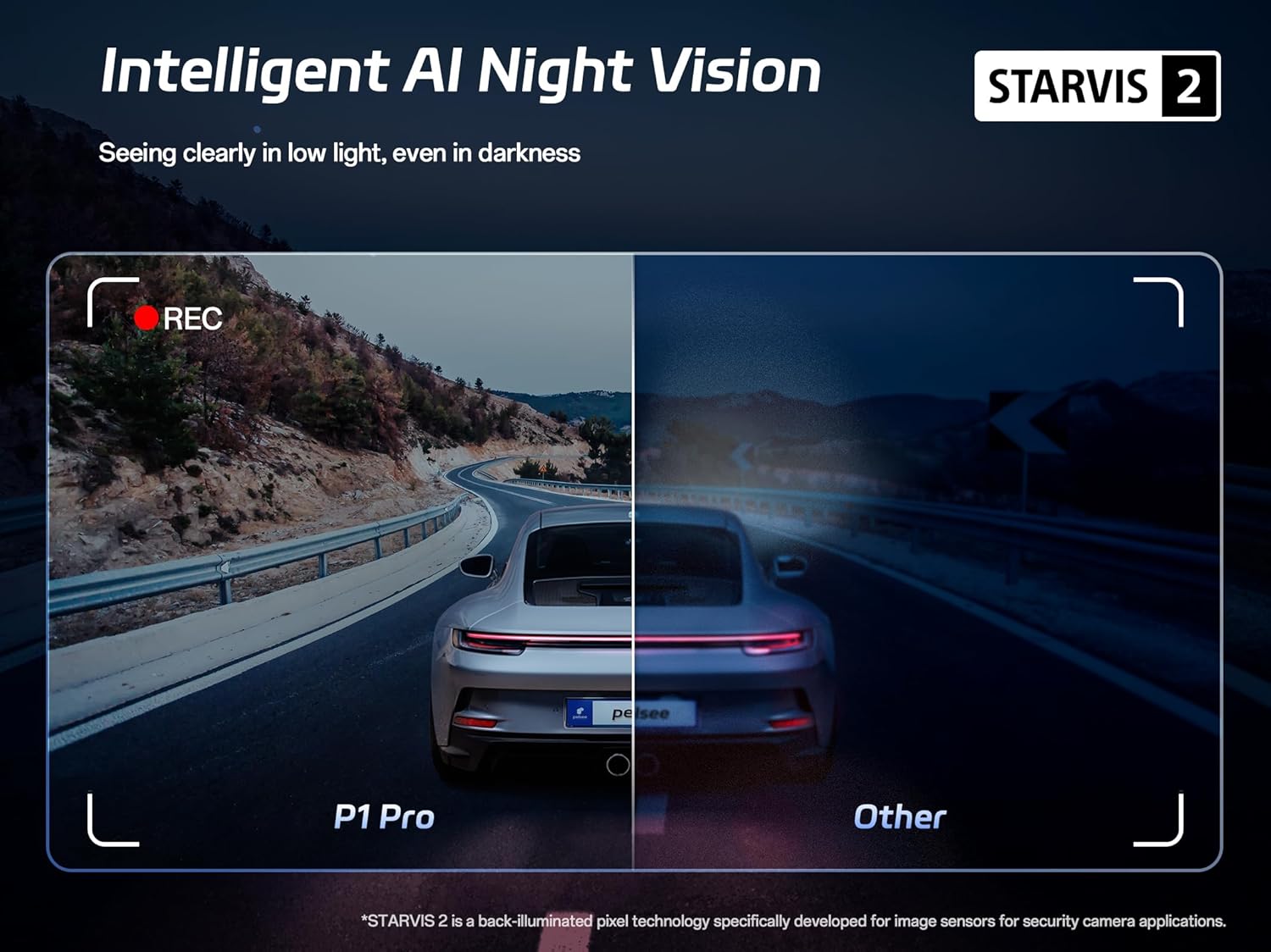 - ăSTARVIS 2 Sensor & AI Night VisionăImage sensor with technology of STARVIS developed by Sony delivers 4x greater low-light sensitivity. Outperforms conventional night vision in all scenarios, from dimly lit urban streets to pitch-black rural roads and underground garages, capturing full color night vision in starlight. ( Hardwire kit is needed )