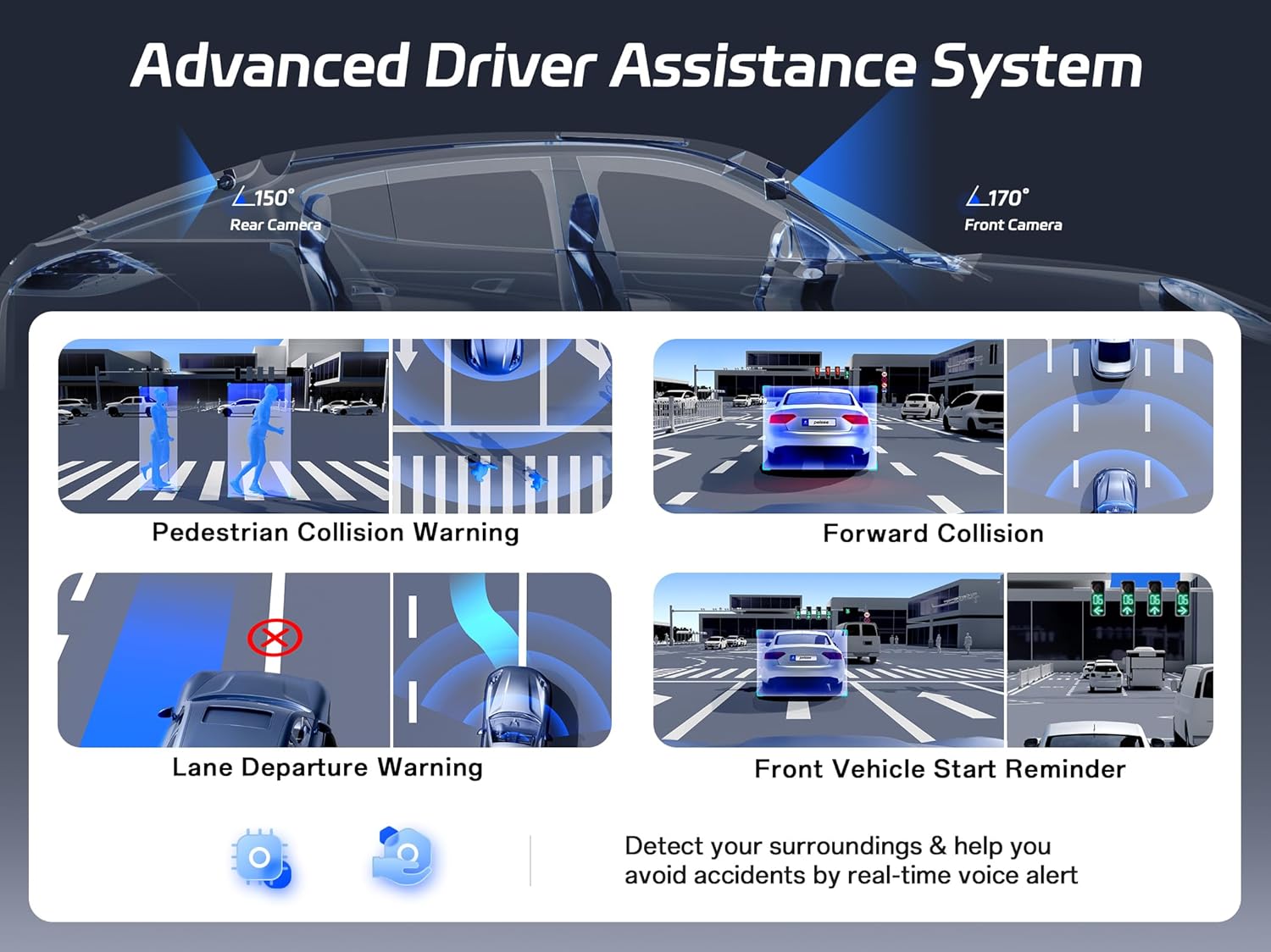 - ăSmart Driving AssistantăAdvanced Driver Assistance System (ADAS) included proactive alerts for forward collision, pedestrian collision, lane departure warning, and front vehicle start reminder. Visual & audio warnings trigger at 0.8-2s reaction time. Your AI co-pilot for highway/city drives.