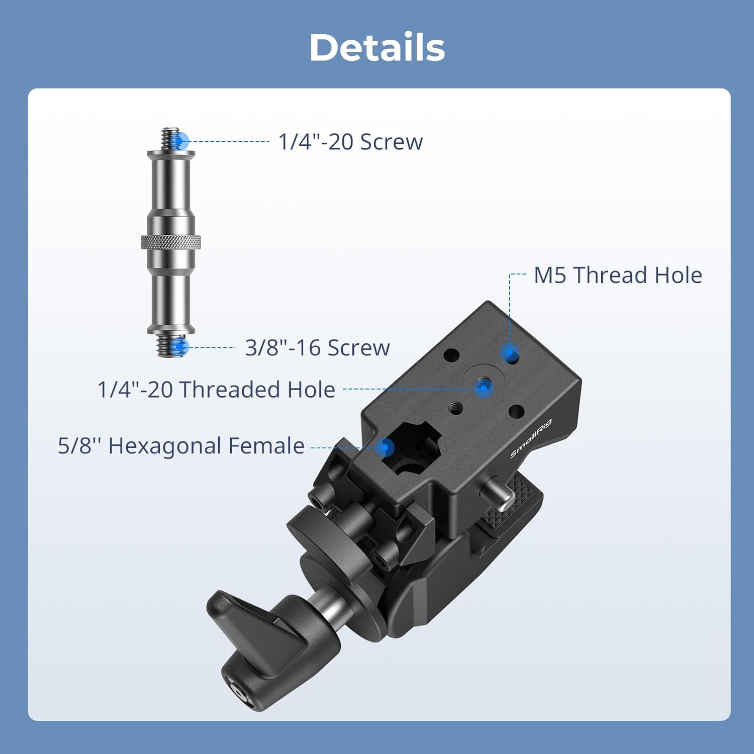 - Standard Threaded Holes: The 1/4"-20 thread connects to a magic arm. You can also use M5 screws to connect other super clamps or magic arm camera mounts, or connect two super clamps 4861 using M5 screws to create a double-headed super clamp