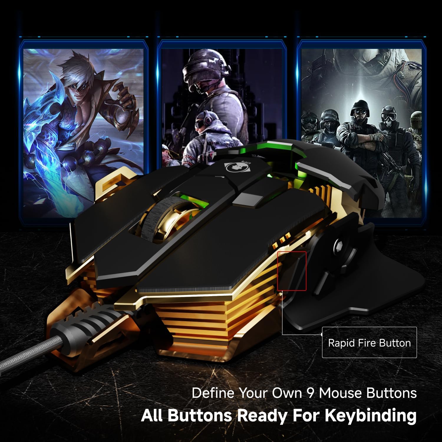 EWEADN G5 Wired Gaming Mouse, Ergonomic RGB Computer Mouse, 12800 Adjustable DPI, 9 Programmable Macro Buttons with Rapid Fire Key Compatible for PC/Laptop/Windows- Black&Gold