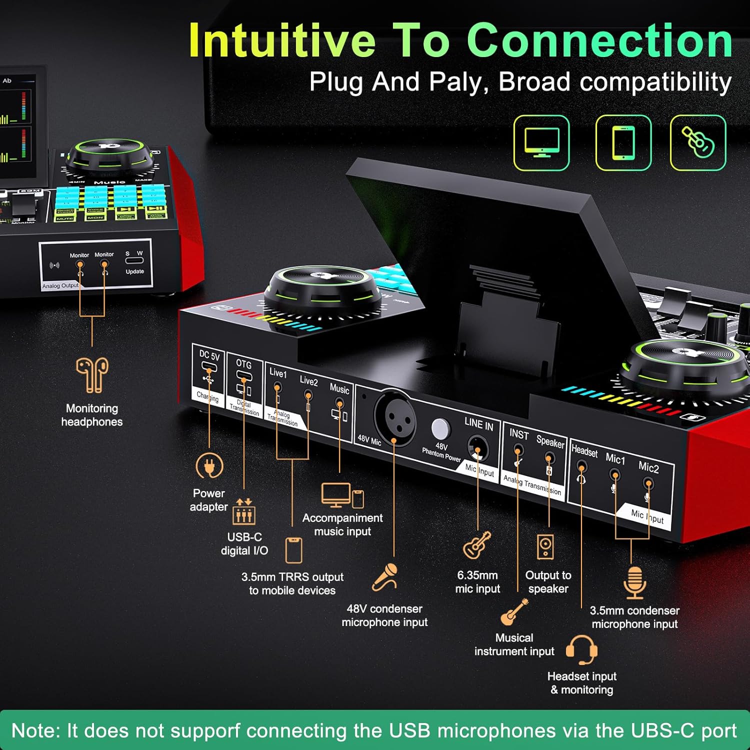 - ăBring The Studio HomeăThe G10 with 5 preset reverb modes, You can adjust the length and depth of reverb freely, 12-step auto-tune, 3 modifiable tones (Treble, mid-range, bass), and pitch changer knobs. Pro features like sidechain, music only, Dry/wet recording, and loopback switch are also included. These functions make this audio interface more entertaining and meet more live recording needs.