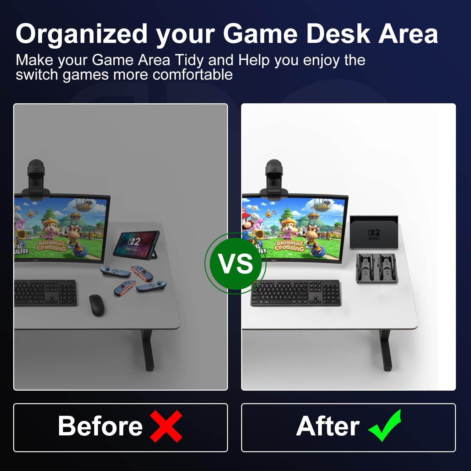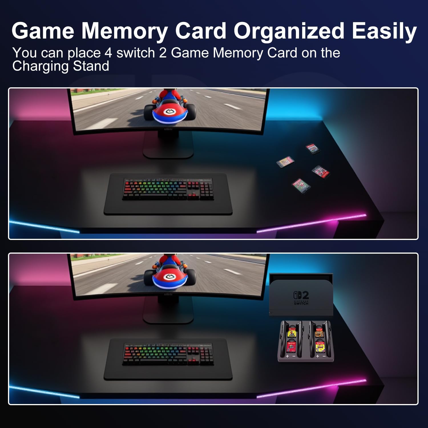 - 【Organized the Switch 2 Devices】: The nintendo switch 2 charging stand is not only providing charging function for your switch 2 controllers, but also can organize your switch devices including controllers and game memory cards, giving you a tidy and clean game desk surface