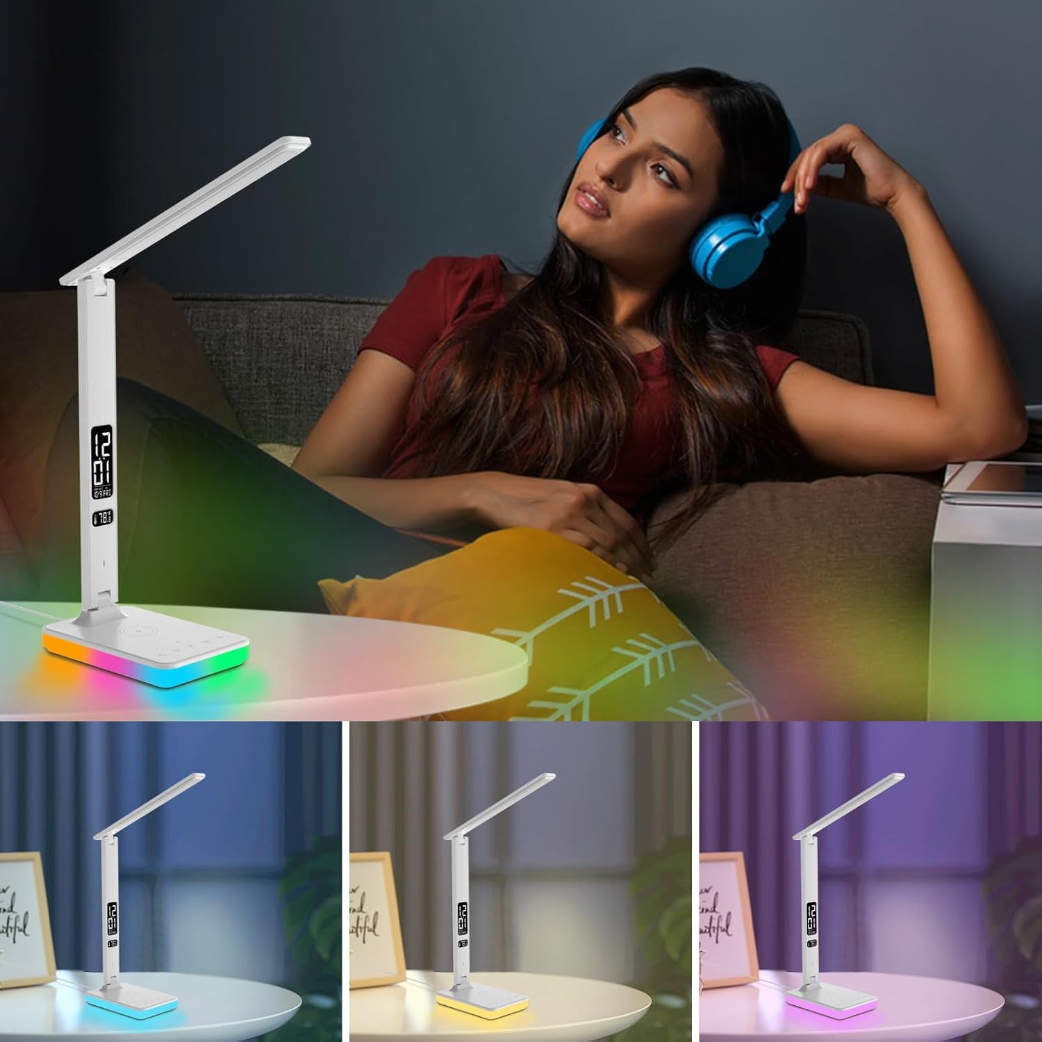 LED Desk Lamp for Home Office, USB Charging Port, Reading Lamp Desk Light with 5 Brightness, 3 Colors, Table Lamp with Clock, Alarm, Date, Temperature, Desk Lamp for College Dorm Room (White)