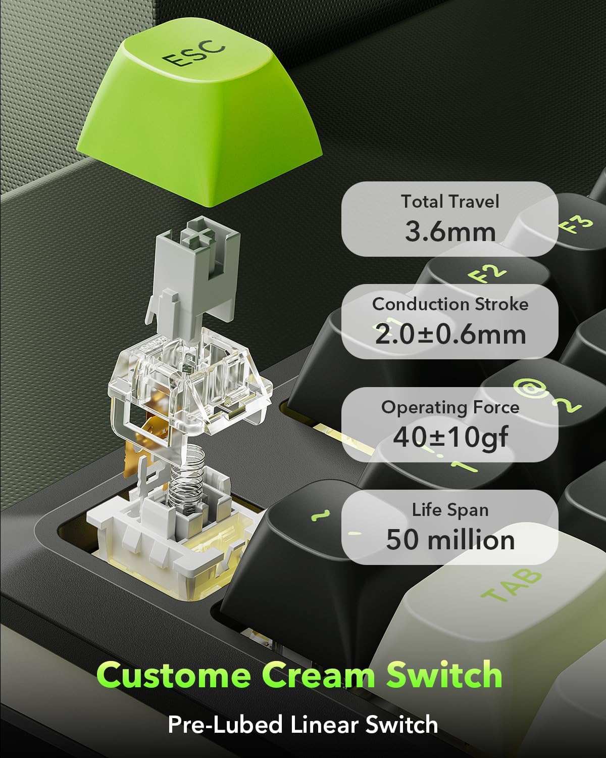 - ăCustom hick-lubed Switchă The K734BWG features thick-lubed custom linear switches with a gasket design, offering cushioned travel and smooth typing feedback.The upgraded socket is compatible with nearly all switches (3/5 pins) for hot swappable replace.