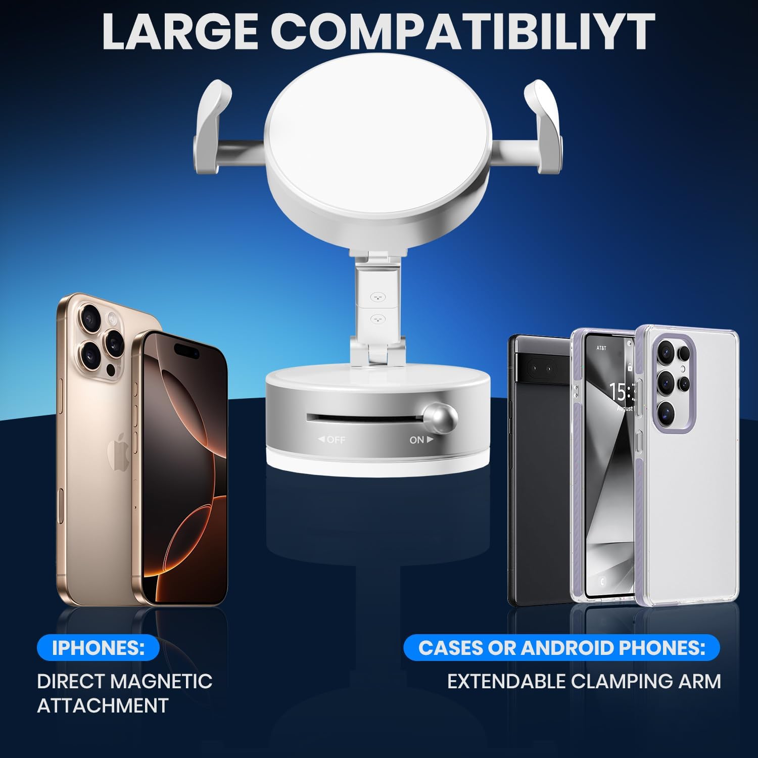 - Works with Every Phone: This vacuum suction phone holder is not only fully compatible with the 12- to 16 series MagSafe iPhones. And, if your phone is non-magnetic, our magnetic clip-on phone holder can also serve you. Our phone holder is suitable for all smartphones