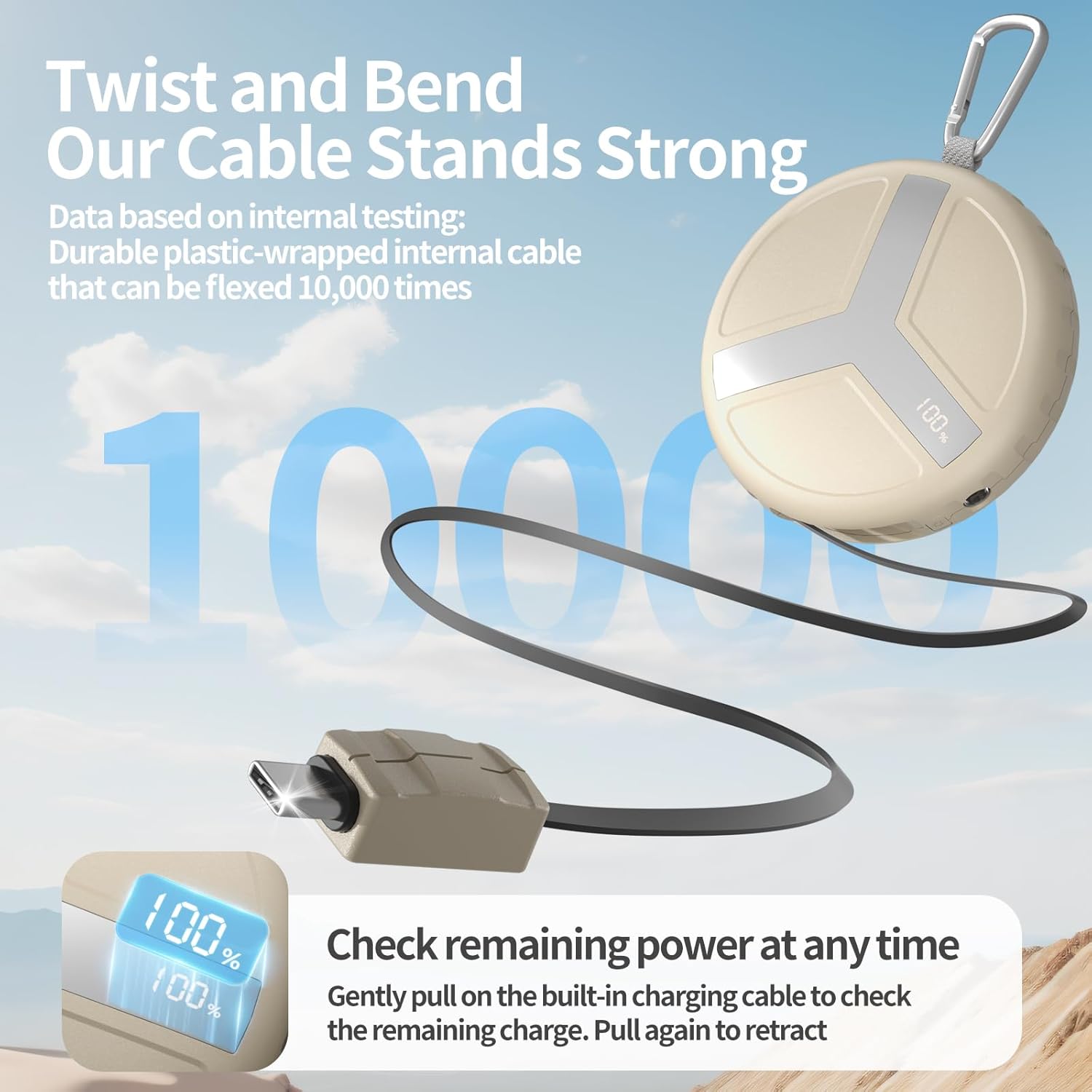 - Built-in Cable for Mobility: Equipped with a Type-C cable, one can extend up to 25.5 inch(65cm), shrink tens of thousands of times and withstand tens of thousands of bends. The long length makes it more convenient for you to use the outdoor power bank