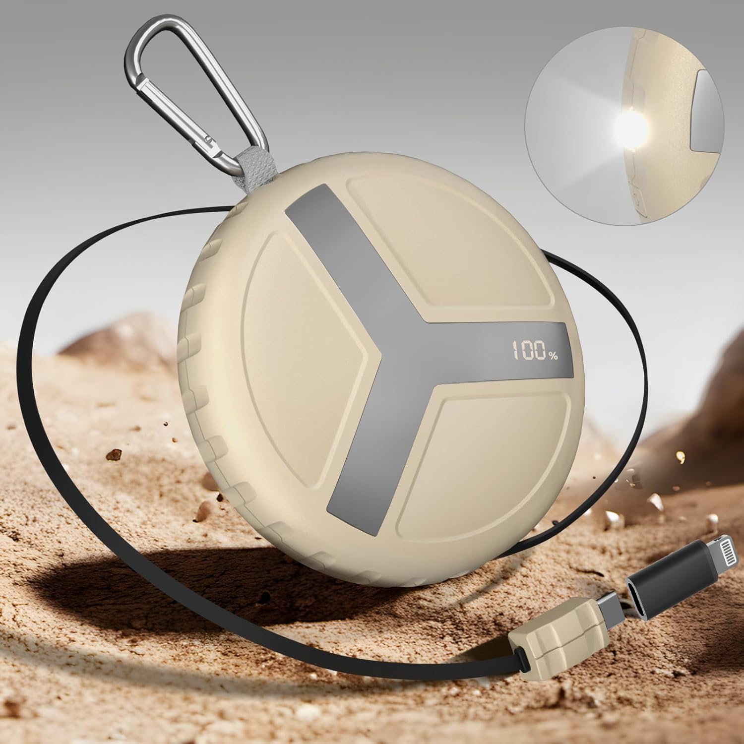 Vivilumens Power Bank Portable Charger 10,000mAh Retractable 25.5 in Built-in Cable Fast Charging Battery Pack USB-C for iPhones Galaxy Laptop with Flashlight&Carabiner for Camping Backpacking Travel