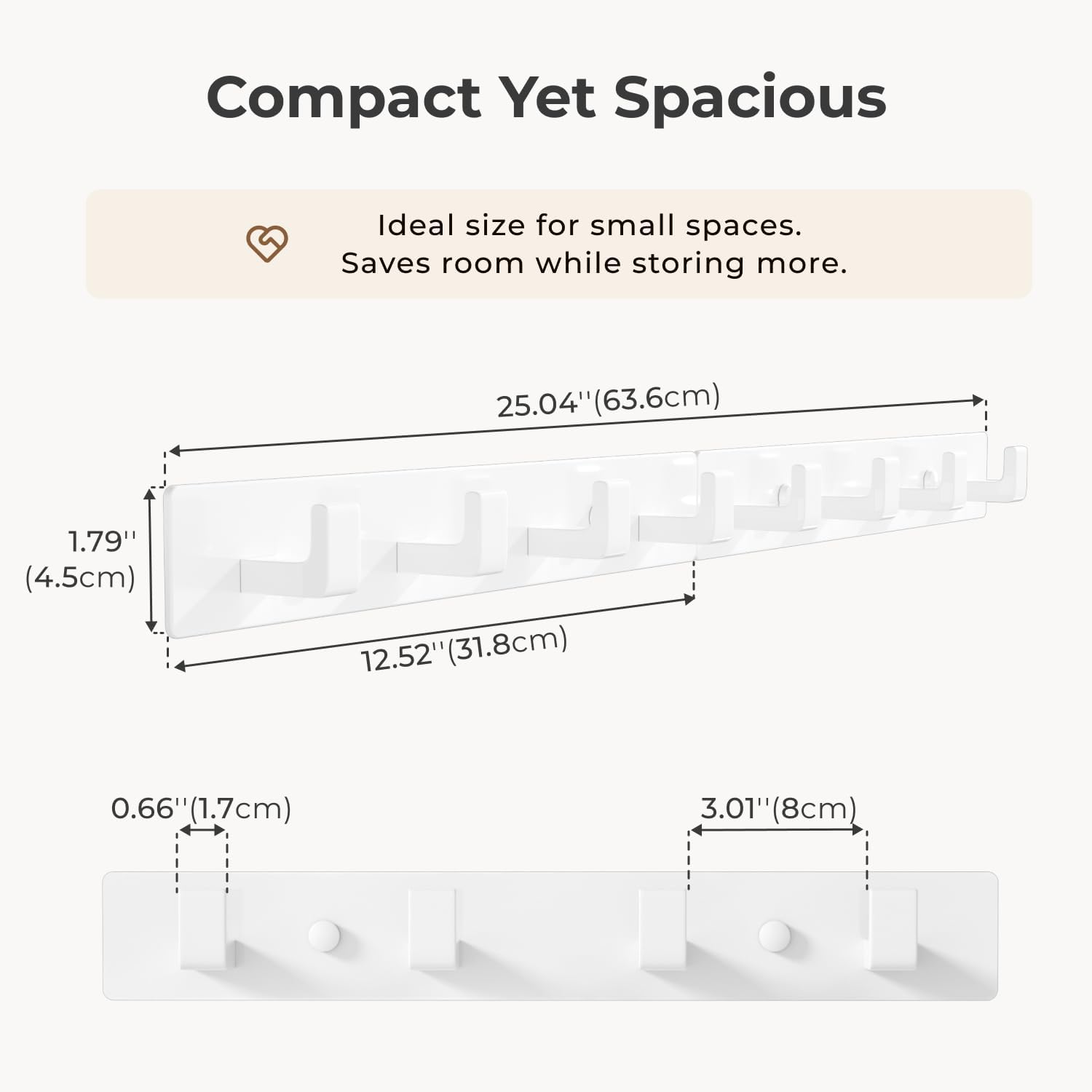 White Wall Mounted Coat Rack - 2 Modular Rails (25'' Total), 8 Right-Angle Hooks, Modern Organizer for Entryway, Bathroom, Bedroom, Holds Coats, Towels, Hats