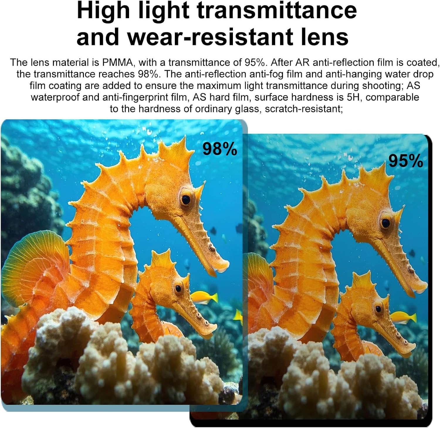 - 【Ultra-Clear Optical Lens】High-transparency PMMA lens with AR coating (98% light transmission) + anti-fog & water-repellent layers, delivering crystal-clear 360° underwater footage.Easy control of the underwater world.