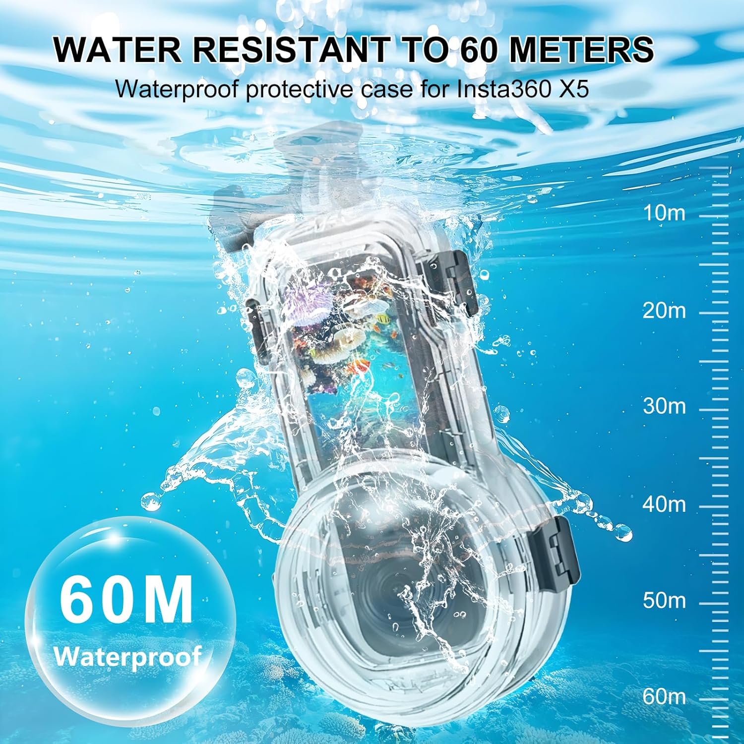 60M/196FT Invisible Diving Case for Insta360 X5 Underwater Waterproof Case Housing Shell for Insta 360 x5 Action Camera Protective Cover Accessories for Diving Surfing Swimming Skiing
