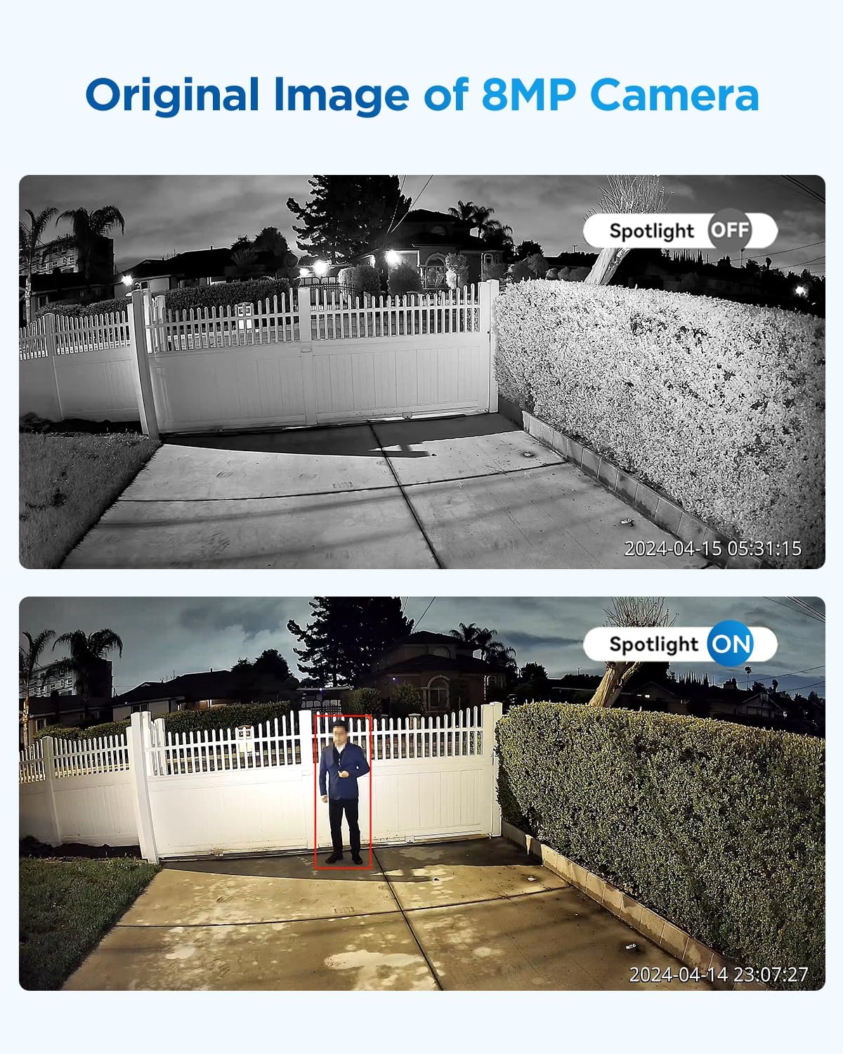 - SMART NIGHT VISION MODE: The camera offers Black & White Night Vision, Full Color Night Vision, and Smart Dual-light Mode options. By default, it is set to Smart Dual-light Mode. When human or vehicle activity is detected, the system automatically switches to Full Color Night Vision to reveal more details. Once the subjects leave, it reverts to Black & White mode for energy-efficient operation