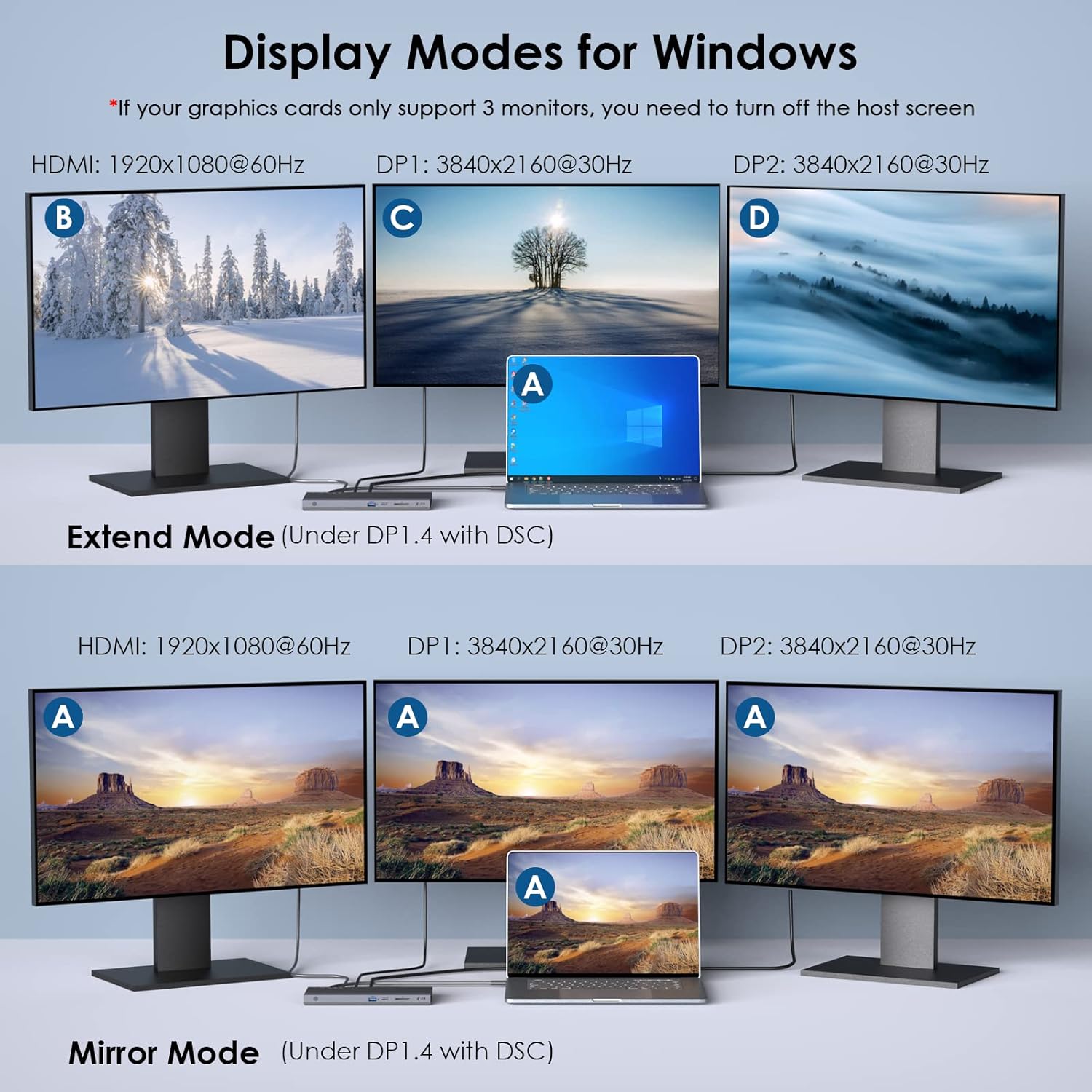 - Triple Display or Dual Monitor: Equipped with dual DP and one HDMI port,Single DP can up to 4K@144Hz under DP1.4 source. Resolution will be 4K@60Hz if two monitors play simultaneously.Connect up to three monitors simultaneously.it perfect for expanding multiple displays for meetings, presentations, stock chart analysis, programming, and more.(Pls Note: Please make sure that the USB-C port on the host laptop supports video output)