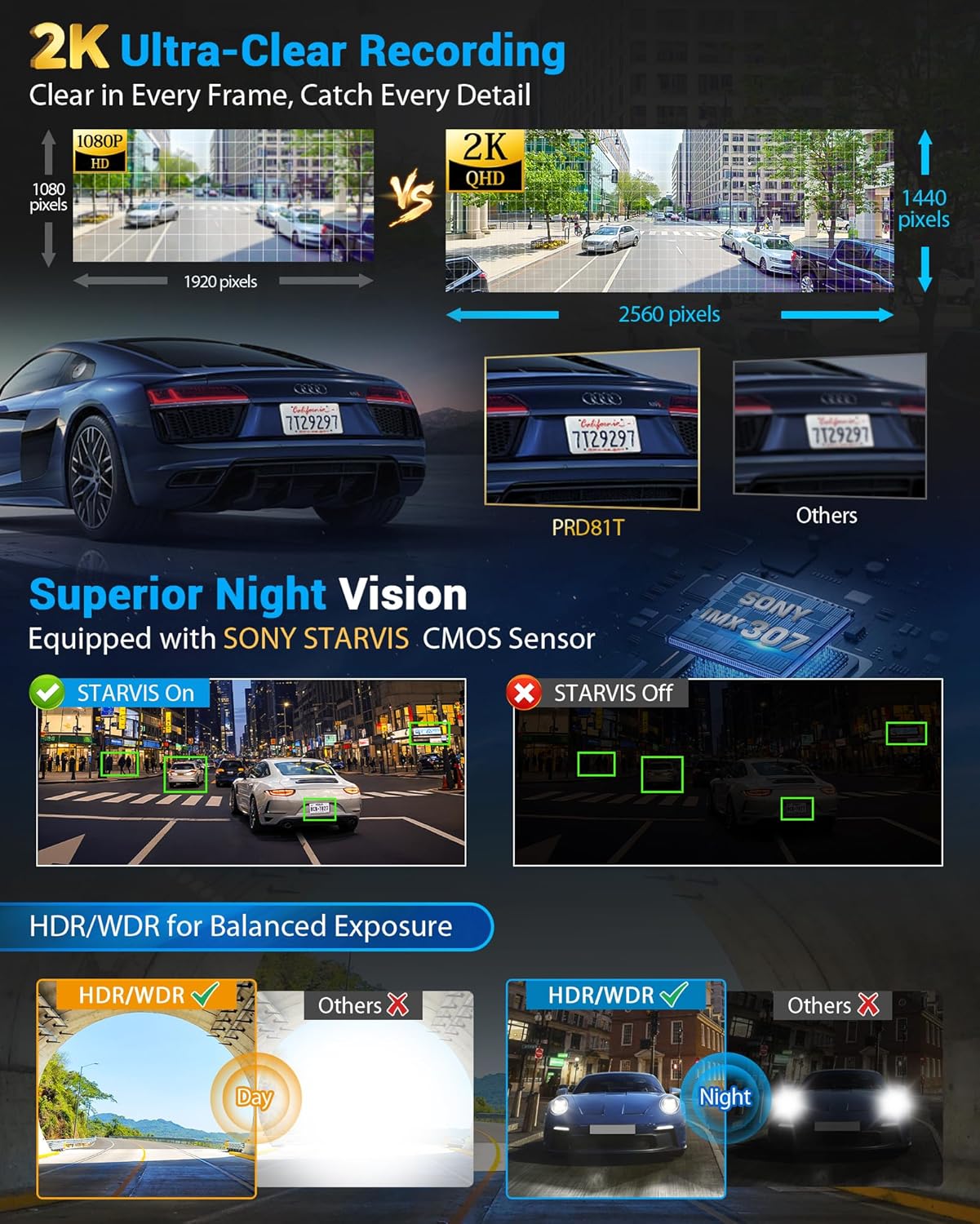 - [Superior Night Vision & 2K Ultra-Clear Recording] Equipped with STARVIS IMX307, HDR and WDR, this mirror dash cam front and rear delivers sharp 2K video and excellent low-light performance. Built-in GPS logs speed and routes, providing reliable evidence for every trip.