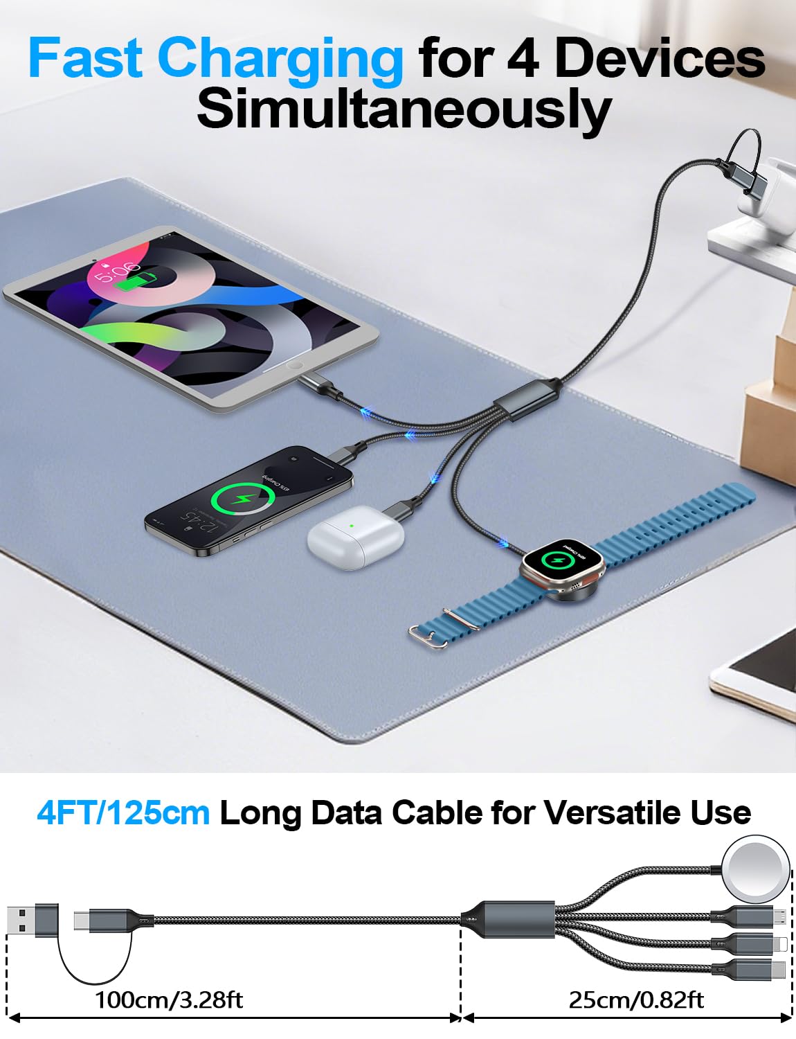4-in-2 Multi Charging Cable for Apple Watch Charger/Samsung/iPhone Charger,Car/Office/Camping/Travel Essentials,Type C Cable Cord for iWatch Ultra/10-2/iPhone 16-11/Samsung S25-S20,iPad,airPods-Black