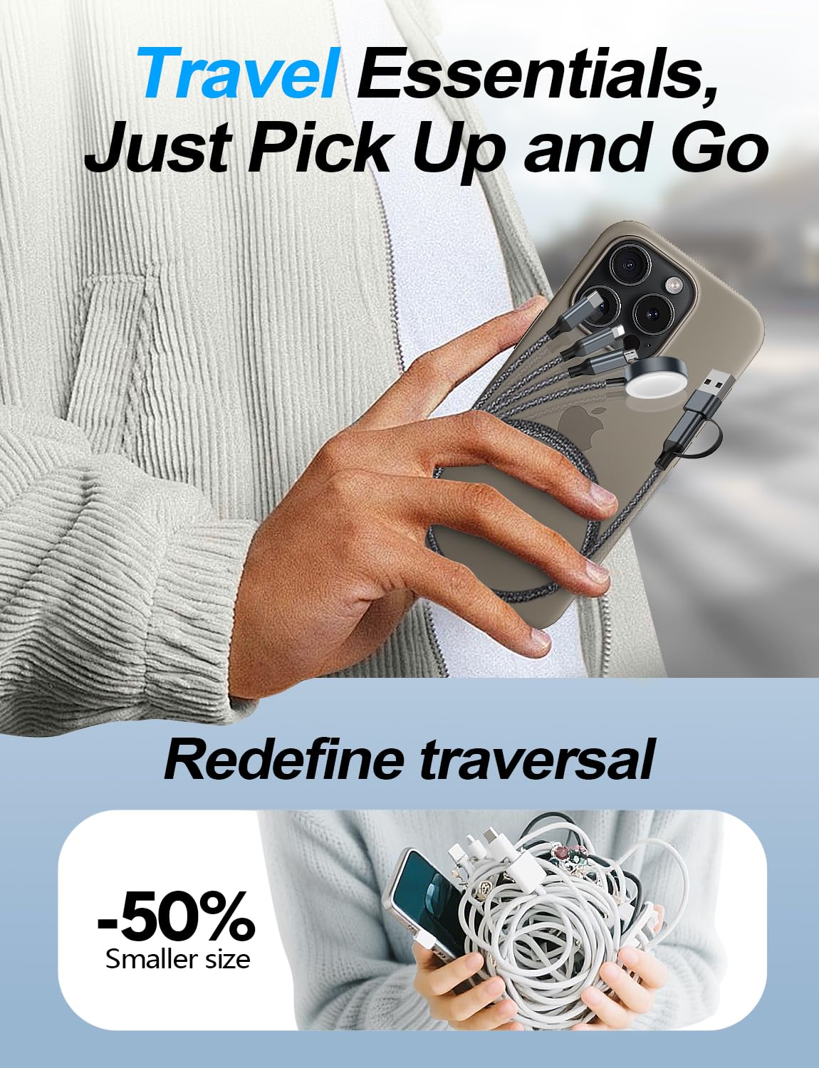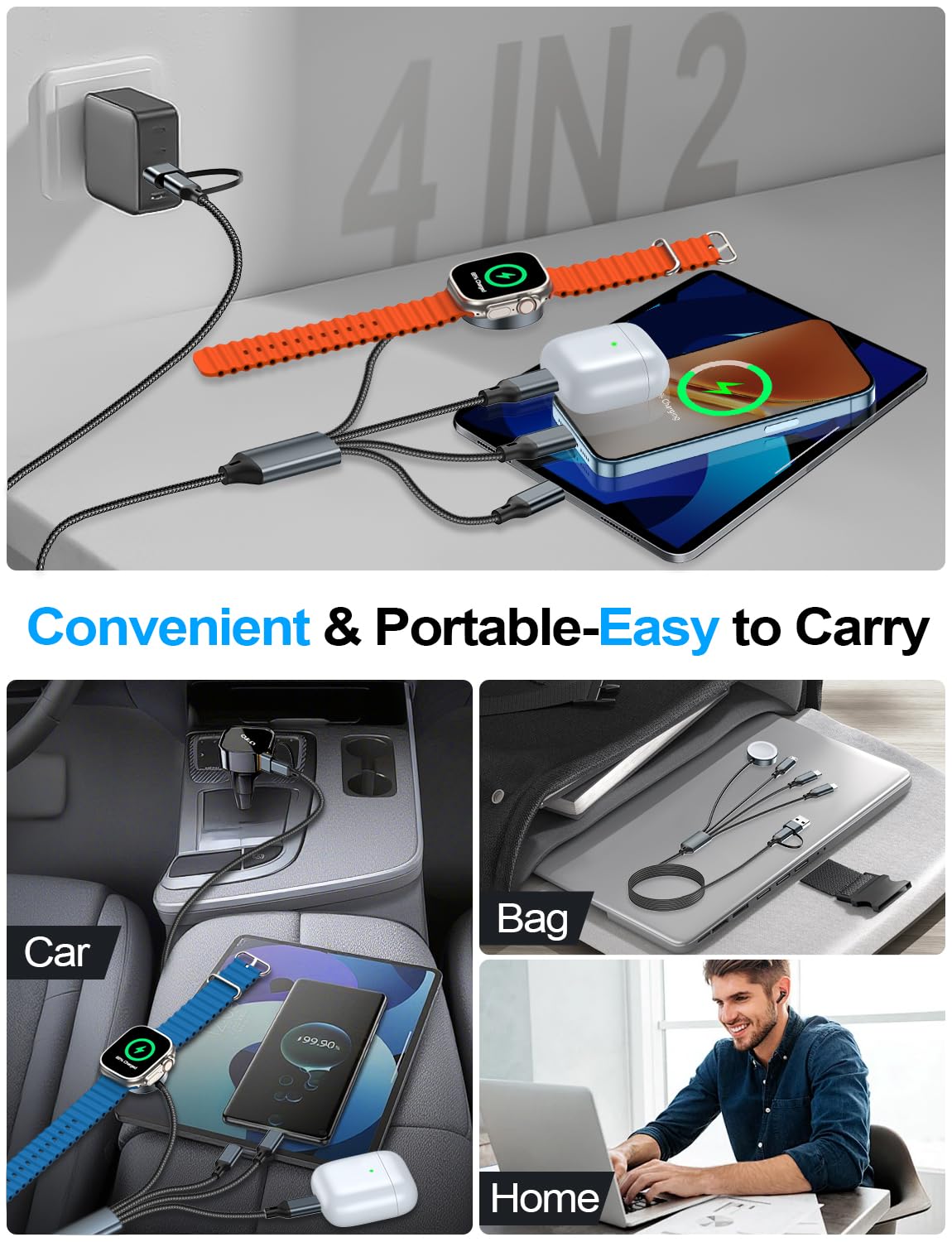 - ăTravel Essentials & ConvenientăThis 4-in-2 Type C/USB A cable is a travel essential and convenient to carry around with lightweight.Use this portable charging cable compatible with Apple Watch/iPhone and Samsung devices on flights, in cars, or with power banksâsuitable for home, office, and travel accessories.It fits in your travel bag smoothly take it on the go, just charging your Apple watch/iPhone/Samsung or any other devices at anytime.