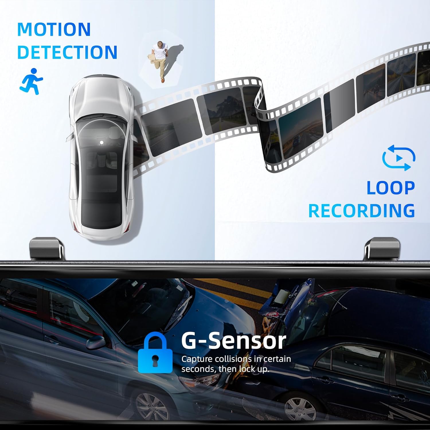 - 🔒 【Loop Recording + G-Sensor + 24H Parking Monitor】 This Dashcam Front Rear Inside supports seamless loop recording, auto-overwriting old files when storage fills. The G-sensor instantly locks collision footage as legal evidence. Enable 24/7 parking surveillance via hardwire kit (ASIN: B0CT8XQVNY), activating motion-triggered recording.