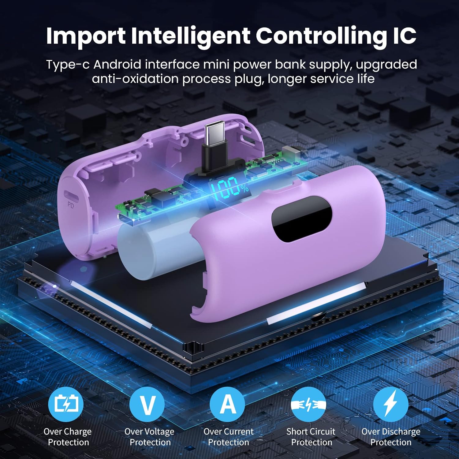 - 【Small Yet Powerful】Despite its small size, the mini portable charger features a 5000mAh capacity that can charge your phone 0.8-1.5 times on a full charge, covering your daily charging needs. Its built-in USB-C connector eliminates the need for extra cables, allowing you to easily charge your phone directly from the charger without carrying additional accessories.