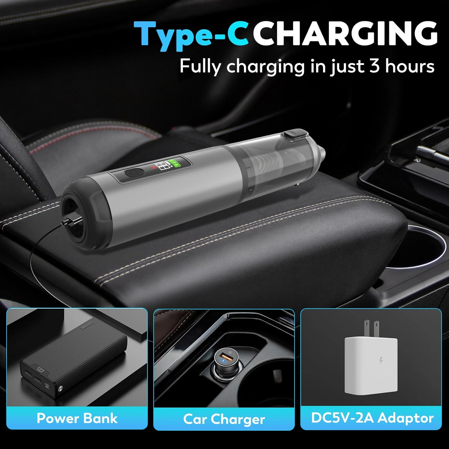 - ăType-C ChargingăHandheld vacuum cordless supports and includes a Type-C charging cable (adapter not included), enabling charging at any USB portâwhether in your car or at home. Fully charges in as little as 3 hours and delivers up to 35 minutes of continuous operation (varies by mode)