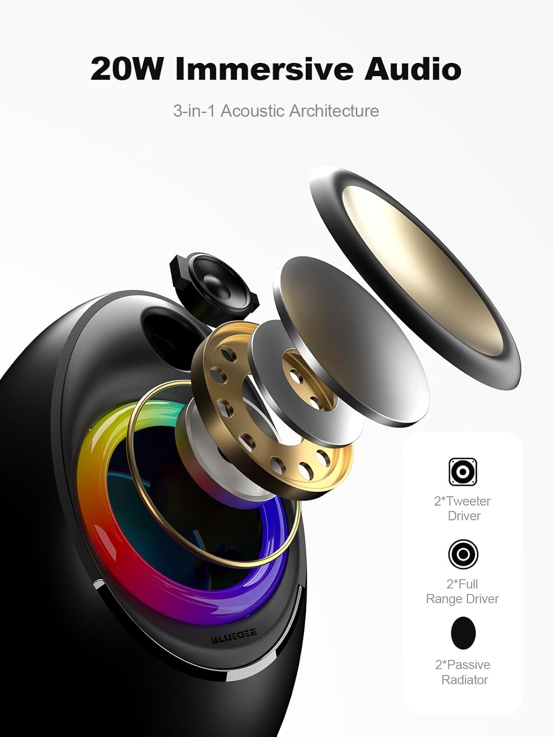 - High-Fidelity Stereo: Bluedee speakers for pc feature 2 tweeters, 2 full-range drivers, and 2 passive radiators, producing premium highs and powerful bass. With a 20W power output, they produce crystal-clear audio