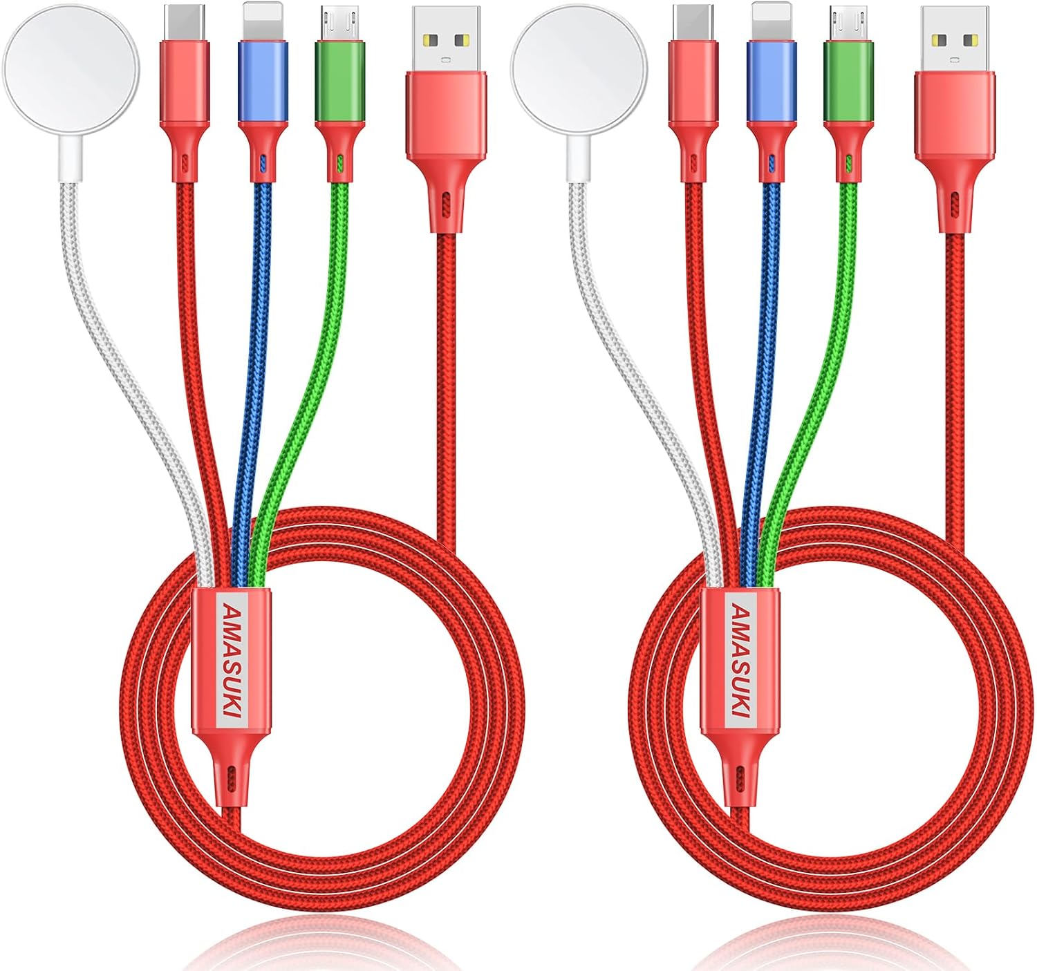 2Pack Travel Essentials Multi Charging Cable for Watch Charger 4 in 1 Fast Charger Camping Essentials USB C/L/Micro Compatible with Watch Series 10-1/SE/Ultra Phone 16 15/Galaxy Android-4FT/Red