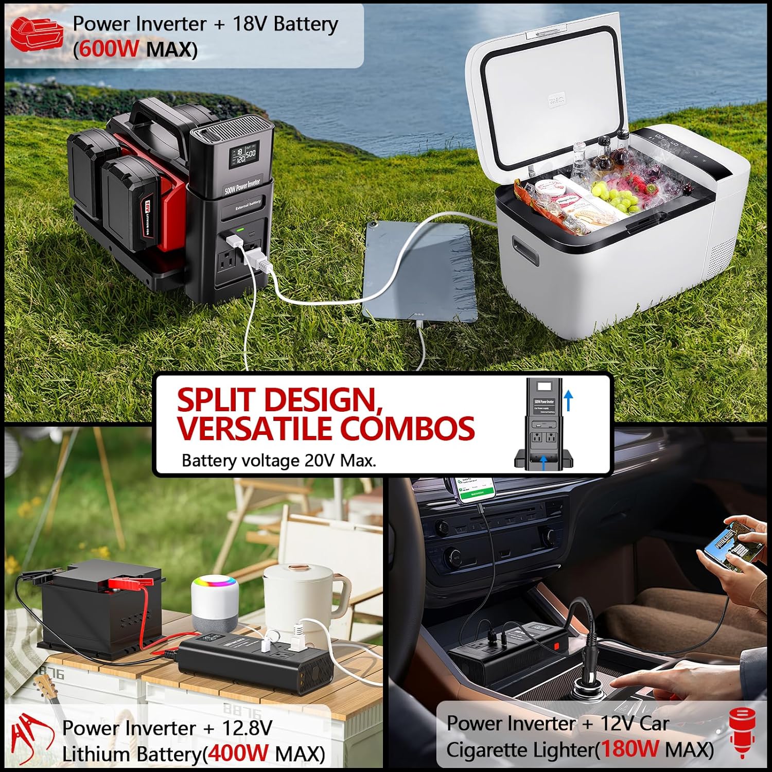 - ⚡500W Pure Sine Wave Power Inverter: Effortlessly power devices like coffee makers, car fridges, TVs, and more with up to 500W output! Compatible with 1-4 Milwaukee 18v M18 batteries—ideal for outdoor adventures, camping, or emergency backup. (Battery not included)